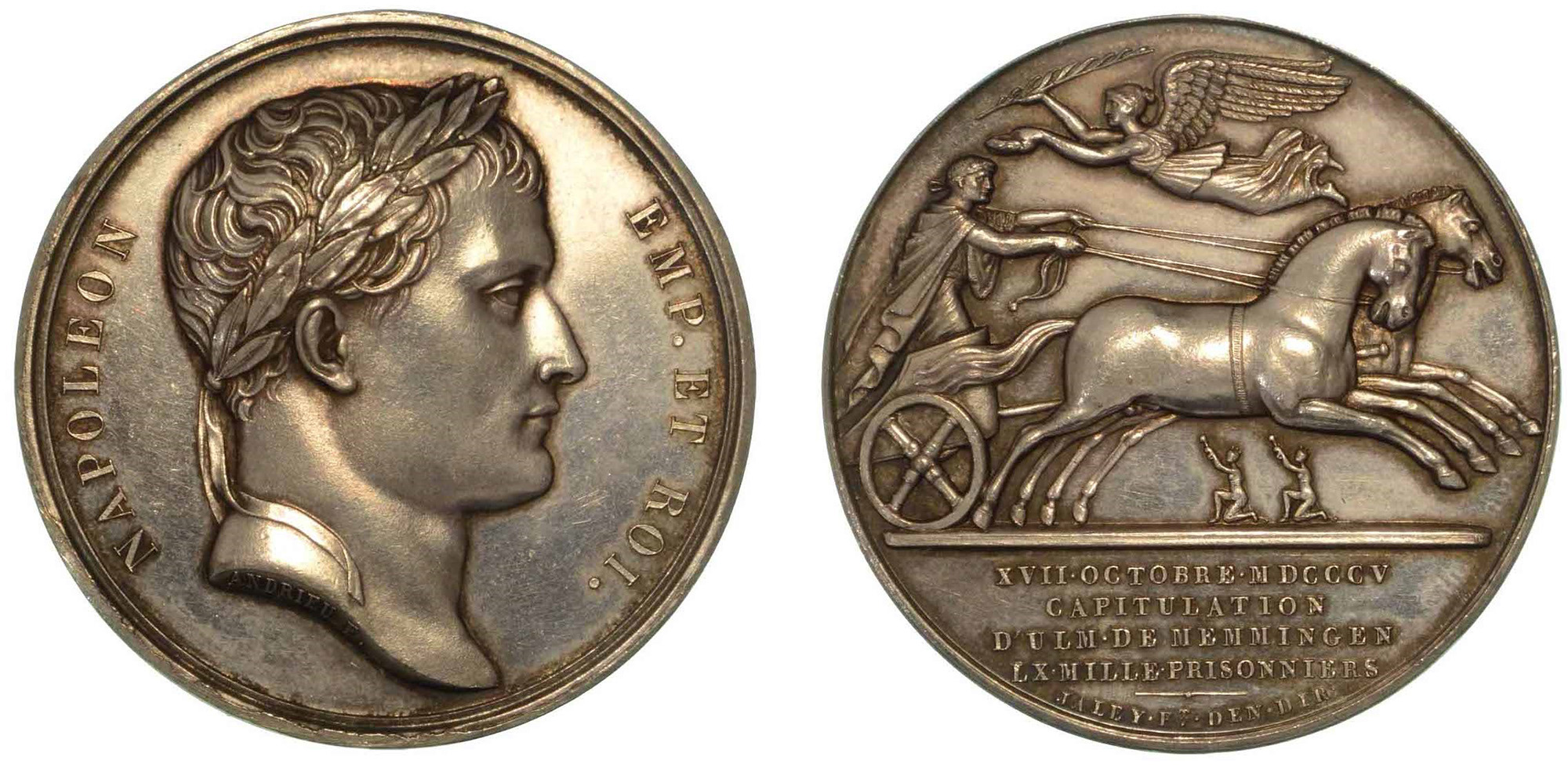 CAPITOLAZIONE DI ULM E MEMMINGEN., Medaglia in argento 1805. Testa laureata a d. R/ L'Imperatore all'antica su biga, in alto la Vittoria con ramo di palma e serto, sotto ai cavalli due figure inginocchiate; in esergo, XVII • OCTOBRE • MDCCV/ CAPITULATION/ D'ULM • DE MEMMINGEN/ LX MILLE • PRISONNIERS/ JALEY F • DENON D • Opus Droz & Jaley. Bramsen cfr. 433. Julius 1416. Essling 1084. diam. mm. 41,3. SPL/FDC