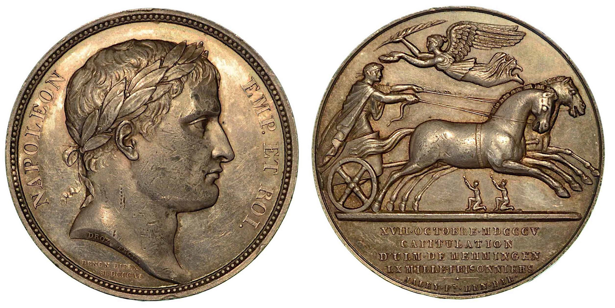 CAPITOLAZIONE DI ULM E MEMMINGEN., Medaglia in argento 1805. Testa laureata a d. R/ L'Imperatore all'antica su biga, in alto la Vittoria con ramo di palma e serto, sotto ai cavalli due figure inginocchiate; in esergo, XVII•OCTOBRE•MDCCV/ CAPITULATION/ D'ULM•DE MEMMINGEN/ LX MILLE• PRISONNIERS/ JALEY F• - DENON D• Bramsen cfr. 433. Julius 1416. Essling 1084. Opus, Droz & Jaley. diam. mm. 40. BB/q.SPL