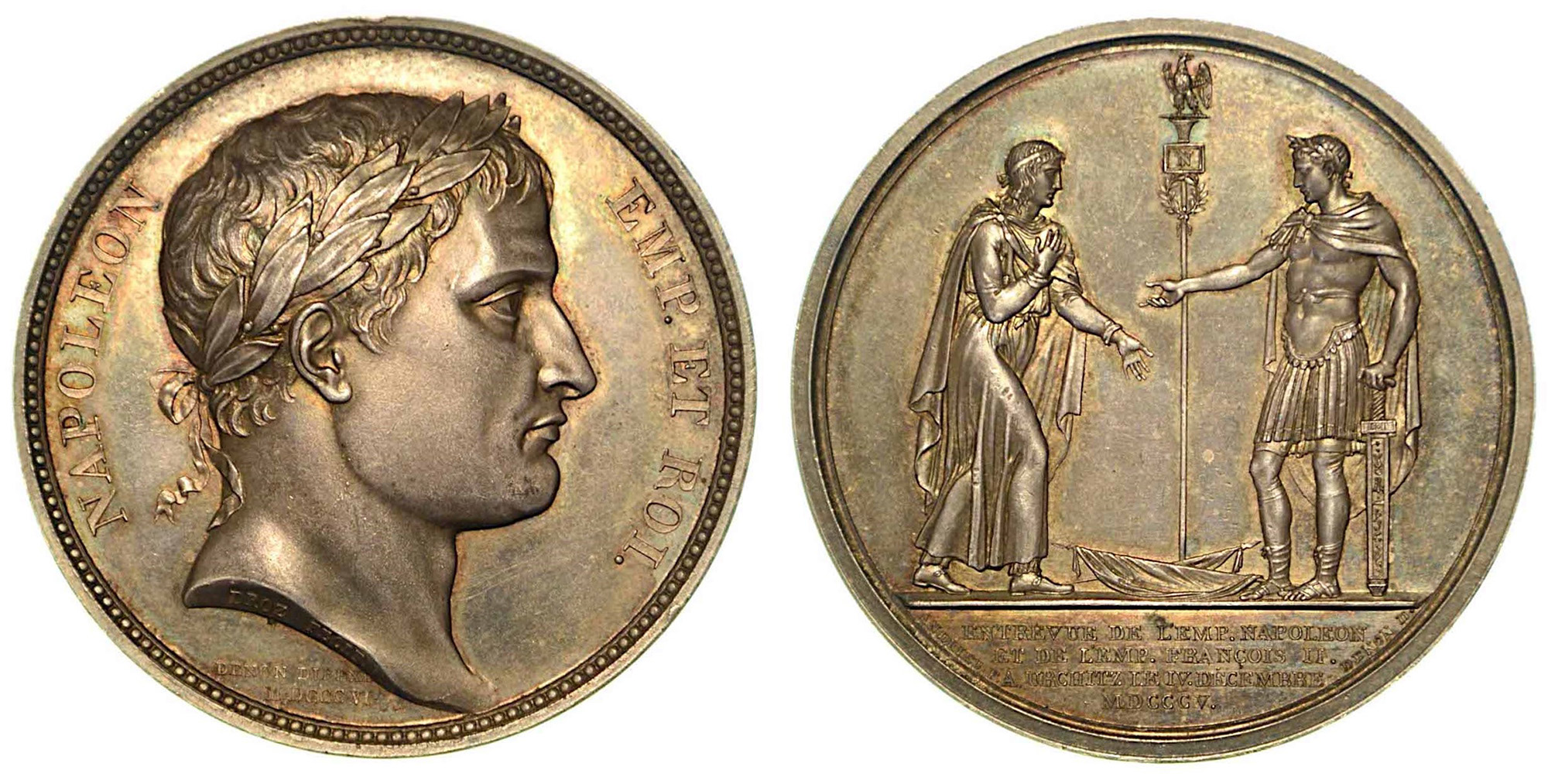 ENTRATA DI NAPOLEONE I E FRANCESCO II IMPERATORE A URSCHÜTZ., Medaglia in argento 1805, Parigi.