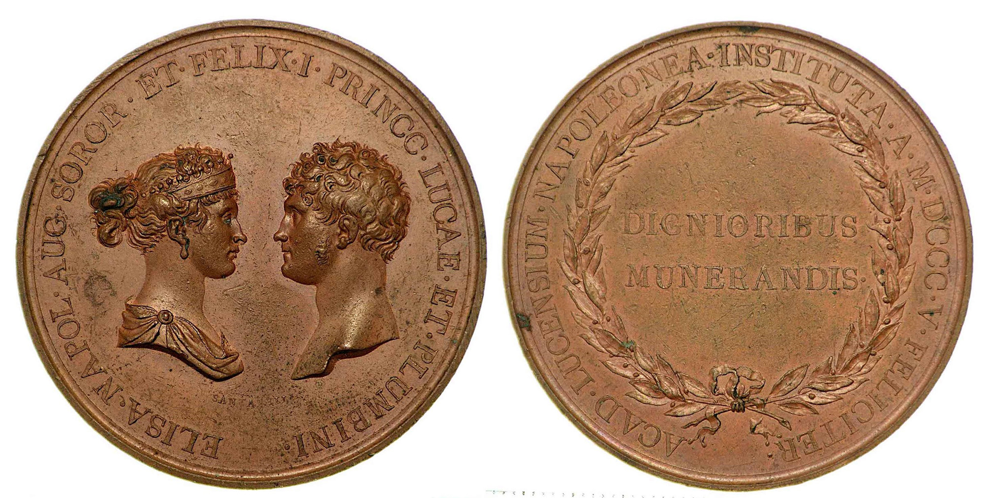 ELISA BONAPARTE E FELICE BACIOCCHI (1805-1814), REGIA ACCADEMIA LUCCHESE DI LETTERE, SCIENZE E ARTI., Medaglia premio in bronzo 1805.
