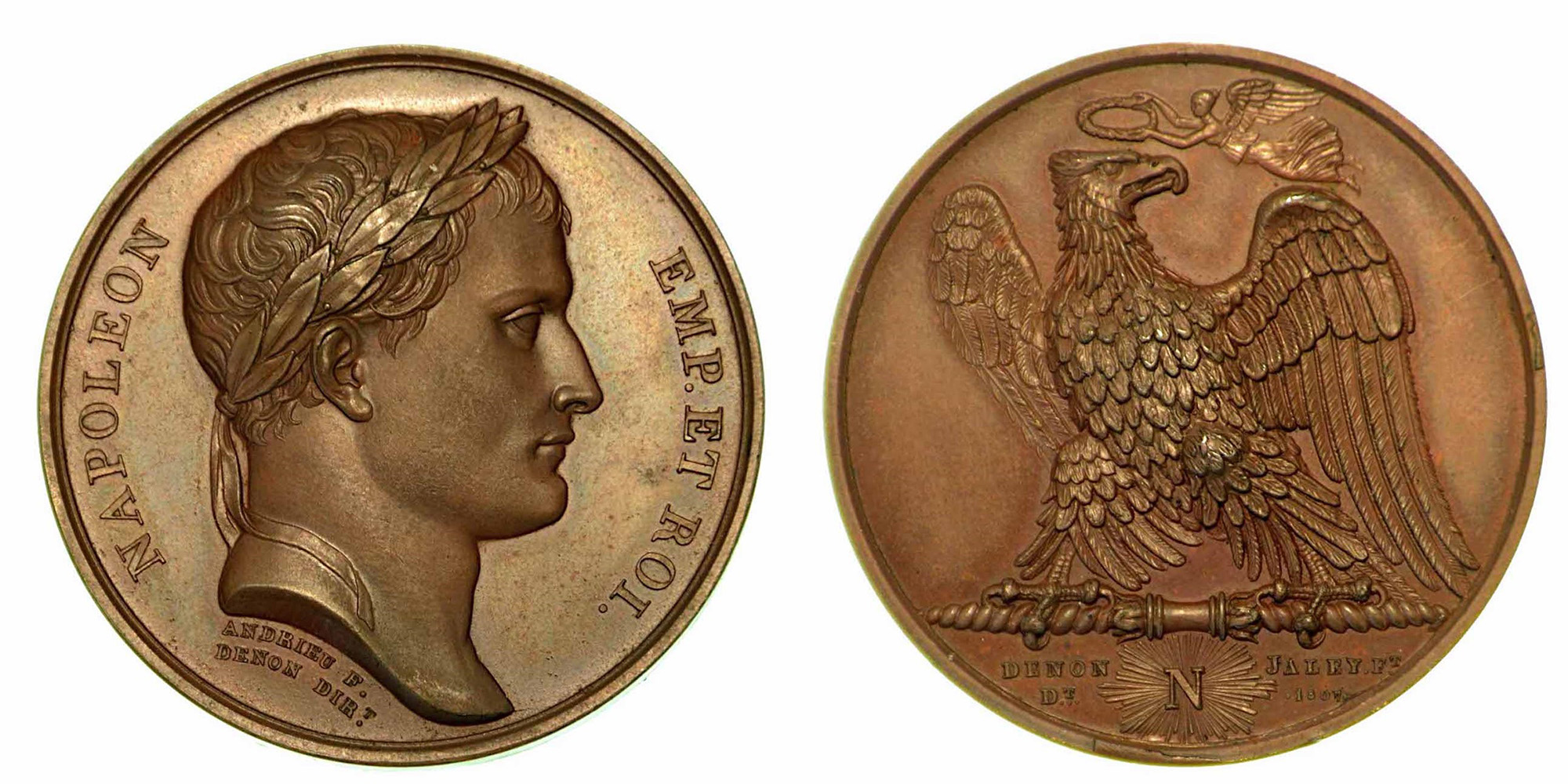 VITTORIE DEL 1807., Medaglia in bronzo 1807. Testa laureata a d. R/ Aquila imperiale, con fulmini tra gli artigli ed ali spiegate e testa volta a d., incoronata da Nike volante con serto di quercia. Opus Andrieu & Jaley. Bramsen 674. Julius 1815. Essling 1189. diam. mm. 41. SPL/FDC