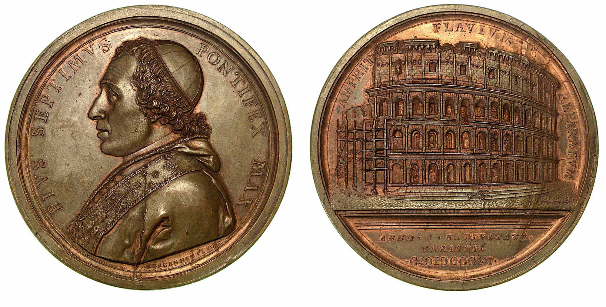 PIO VII, 1800-1823. RESTAURO DEL COLOSSEO IN ROMA., Medaglia in bronzo 1807.