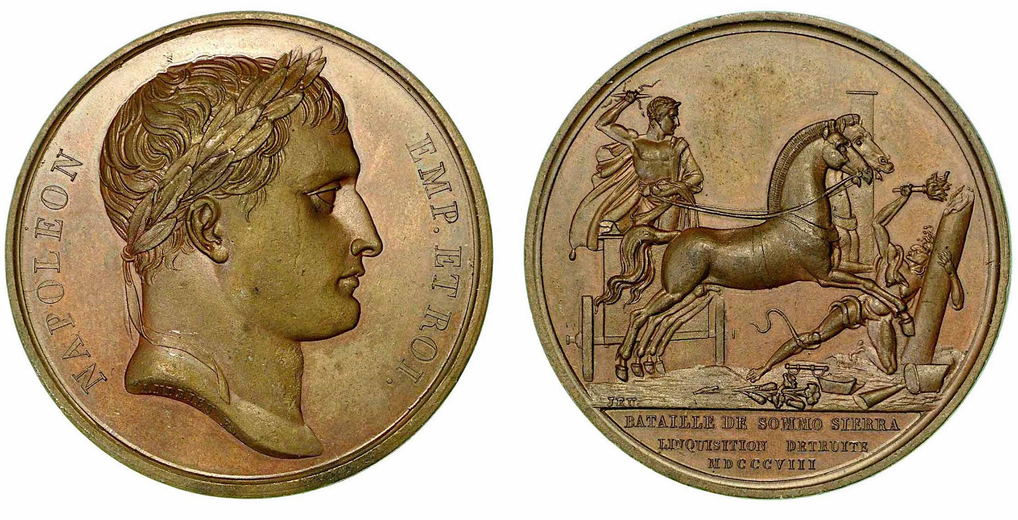 BATTAGLIA DI SOMO-SIERRA IN SPAGNA., Medaglia in bronzo 1808. Testa a d. R/ Nel campo Napoleone su un cocchio tirato da due cavalli atterra il genio dell'Inquisizione che tenta di impedirgli il passaggio fra le colonne d'Ercole. In terra strumenti dell'Inquisizione. Opus Andrieu-Brenet. Bramsen 756. Julius 1944. Essling 1216. diam mm. 41. SPL/q.FDC