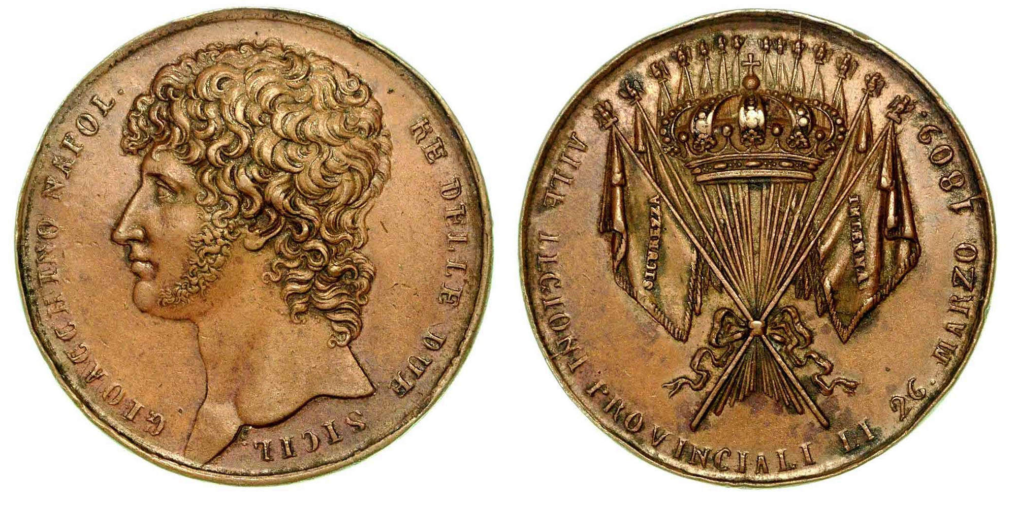 GIOACCHINO MURAT, 1808-1815. REGNO DELLE DUE SICILIE. AGLI ORGANIZZATORI DELLE LEGIONI PROVINCIALI., Medaglia in bronzo 1809. Testa di Gioacchino Murat a s. R/ Gli stendardi delle 14 legioni provinciali uniti da nastro e sormontati da corona. Opus Rega e D’Andrea?. Ricciardi, 82. Siciliano 23. Essling 2550. Bramb. p. 87. Julius 2071/2. Bramsen 842. D’Auria 87. diam. mm. 37,5. q.SPL