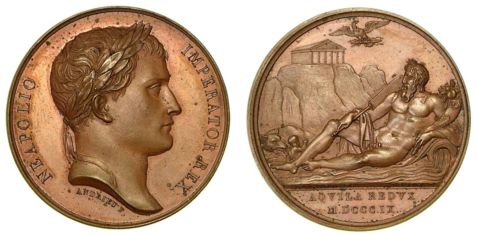 ANNESSIONE DI ROMA ALLA FRANCIA., Medaglia in bronzo 1809, Parigi. NEAPOLIO IMPERATOR REX Testa laureata a d. R/ Il Tevere sdraiato a s. tiene remo e cornucopia, appoggia il gomito su anfora cui esce il fiume, dietro, a s., lupa accovacciata con gemello. In alto, aquila imperiale spiegata. Sullo sfondo, rocce con tempio. Opus Andrieu. Bramsen. cfr. 848. Julius 2089. Turr. 702. diam. mm. 41. SPL/q.FDC