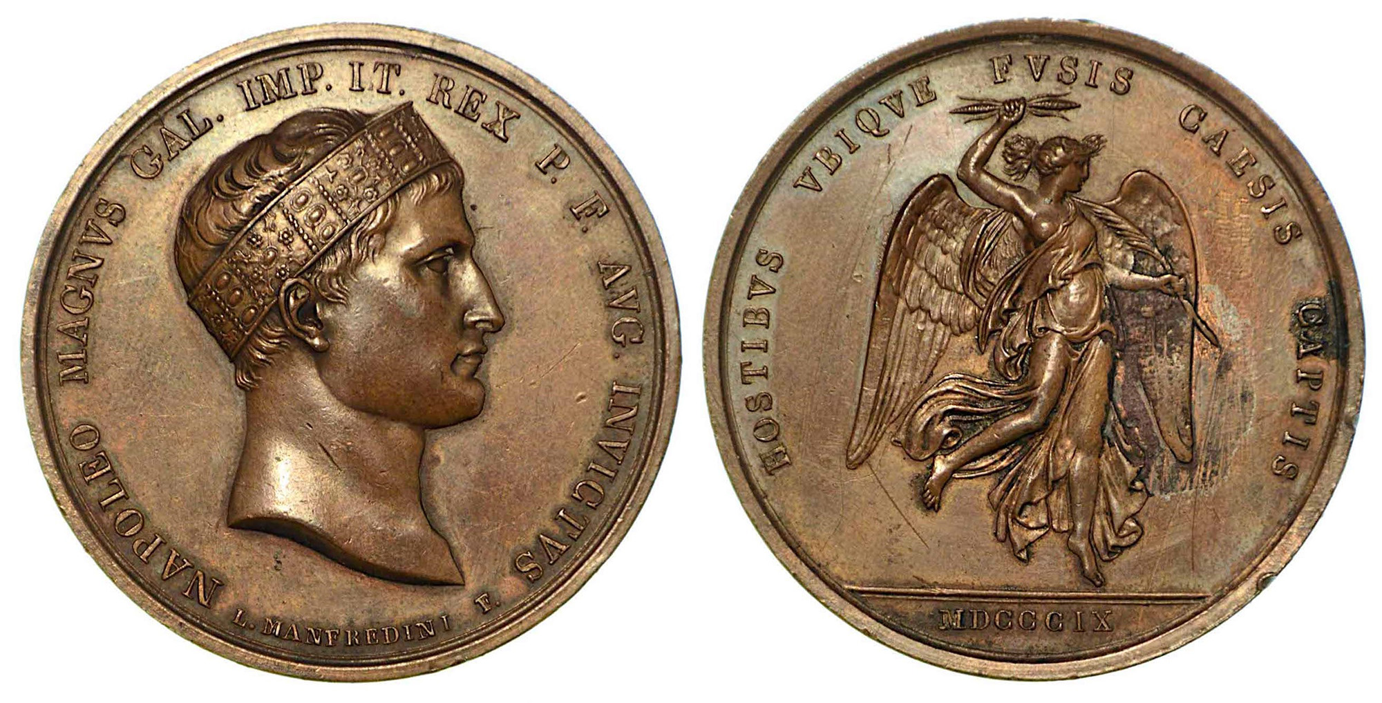 BATTAGLIA DI WAGRAM., Medaglia in bronzo 1809. Testa a d. con corona ferrea. R/ Nel centro la Vittoria alata con nella mano destra il fulmine e nella sinistra la palma. Opus. L. Manfredini. Julius 2112. Bramsen 862. Essling 1243. Coll. Beraud 1931, n.1585. diam. mm.42. BB/q.SPL
