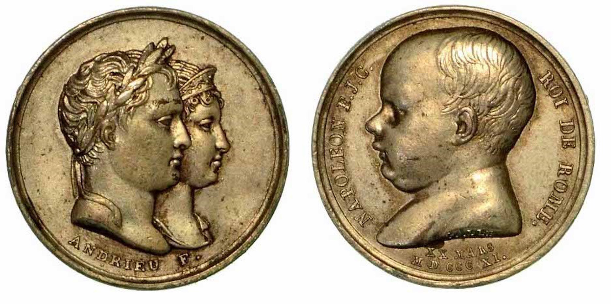 NASCITA DEL RE DI ROMA., Medaglia in argento 1811, Parigi. Teste a laureata accollate a d. di Napoleone e Maria Luigia d'Austria. R/ Busto a s. del Re di Roma. Opus Andrieu. Bramsen 1091. Julius 2422. Essling 1335. Turricchia 753. diam. mm. 15. q.SPL