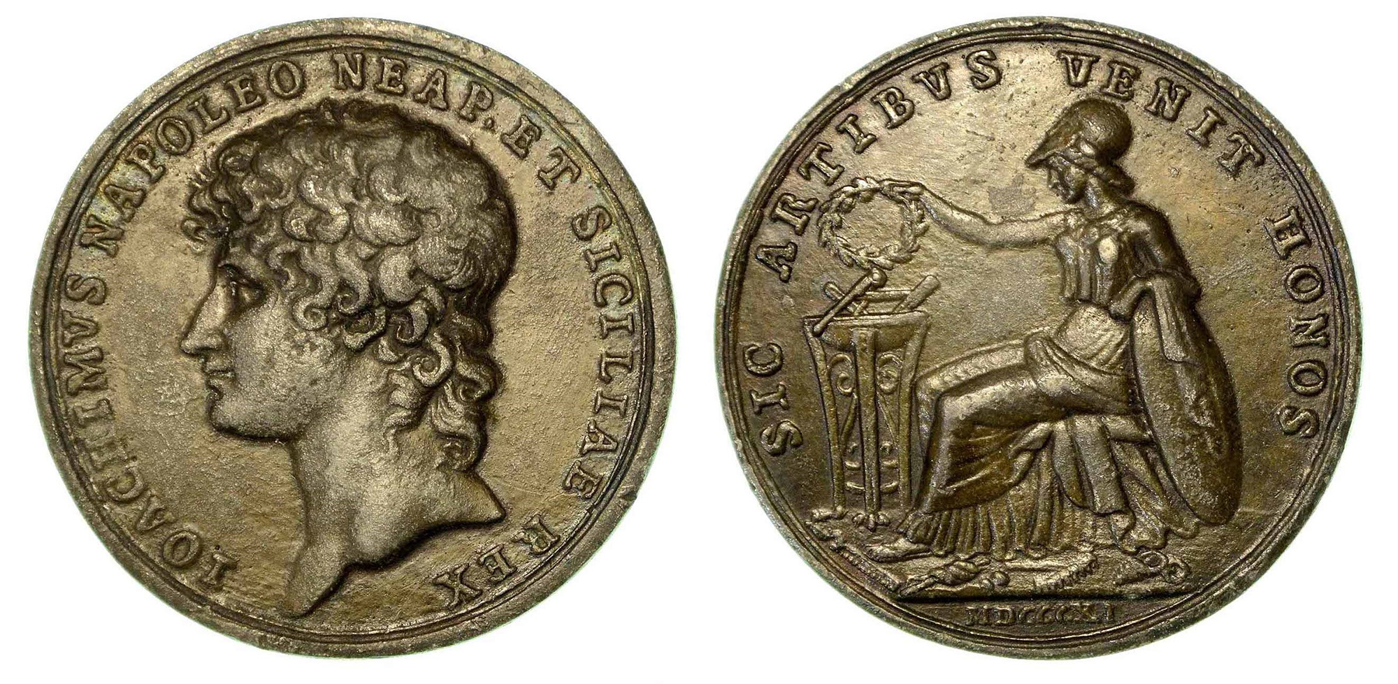 GIOACCHINO MURAT, 1808-1815. PREMIO ALLE ESPOSIZIONI DI BELLE ARTI E DELLE MANIFATTURE., Medaglia in piombo 1811. IOACHINVS NAPOLEO NEAP.ET SICILIAE REX Testa del Re a s. R/ SIC ARTIBVS VENIT HONOS Minerva galeata, seduta a s., posa con la d. una corona di alloro su di un tripode e poggia l'avambraccio sinistro su di uno scudo; all'esergo, MDCCCXI. Ricciardi 86. Siciliano 28. Julius 2476/7. Bramsen 1136. Essling 2563. D'Auria 93. diam. mm. 41,8. BB/q.SPL