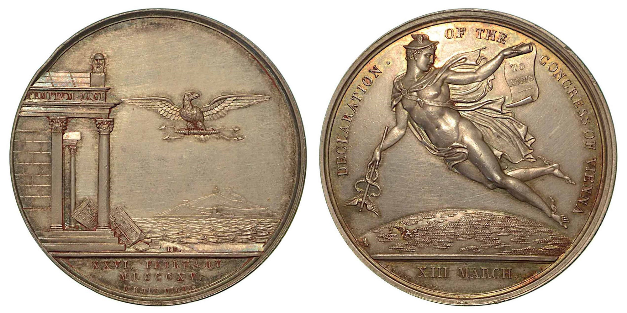 DICHIARAZIONE DEL CONGRESSO DI VIENNA., Medaglia in argento 1815, Londra. Aquila imperiale spiegata con fulmini tra gli artigli vola sopra il mare, dietro, sullo sfondo a d. Isola d'Elba, a s. il Tempio di Giano con le porte scardinate. R/ Mercurio in volo con caduceo e pergamena, sotto semiglobo terracqueo. Opus Depaulis & Brenet. Bramsen 1597. Julius 3289. Essling 1559. diam. mm. 41. SPL/FDC