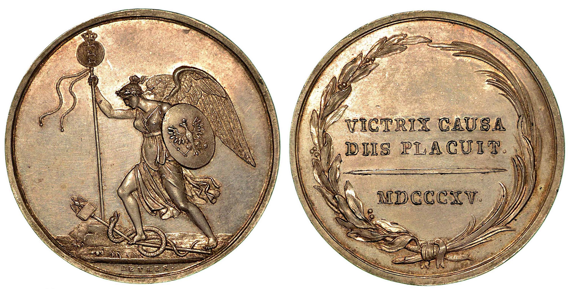 BATTAGLIA DI WATERLOO., Medaglia d'argento 1815. Vittoria con scudo prussiano e stendardo inglese schiaccia l'aquila francese. R / VICTRIX CAUSA / DIIS PLACUIT / MDCCCXV in corona di alloro e rami di palma. Opus Detler. Bramsen 1638, Julius 3338. diam. mm. 49,5. SPL/q.FDC