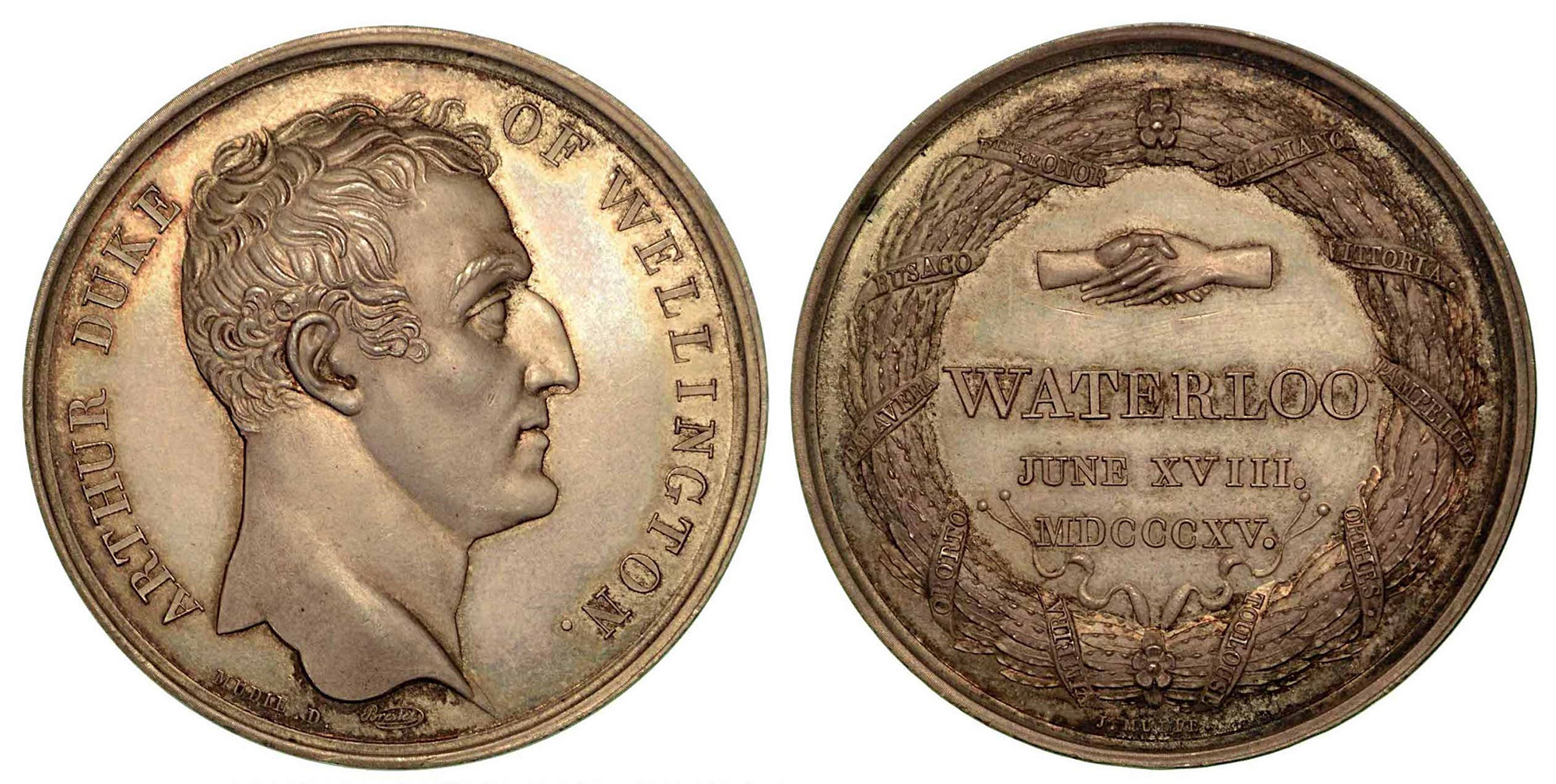 BATTAGLIA DI WATERLOO., Medaglia in argento 1815, Birmingham. Testa a d. di Wellington. R/ In serto di lauro intrecciato con nastro che cita le principali vittorie inglesi: FTES DE ONOR/ BUSACO/ TALAVERA/ OPORTO/ VIMEIRA/ TOULOUSE/ ORTHES•/ PAMPELUNA/ VITTORIA•/ SALAMANCA. Nel campo: (mani giunte) / WATERLOO/ JUNE XVIII•/ MDCCCXV• Opus Brenet & J Mudie. Bramsen 1645. Julius 3349. Essling 1604. diam. mm. 41. q.FDC