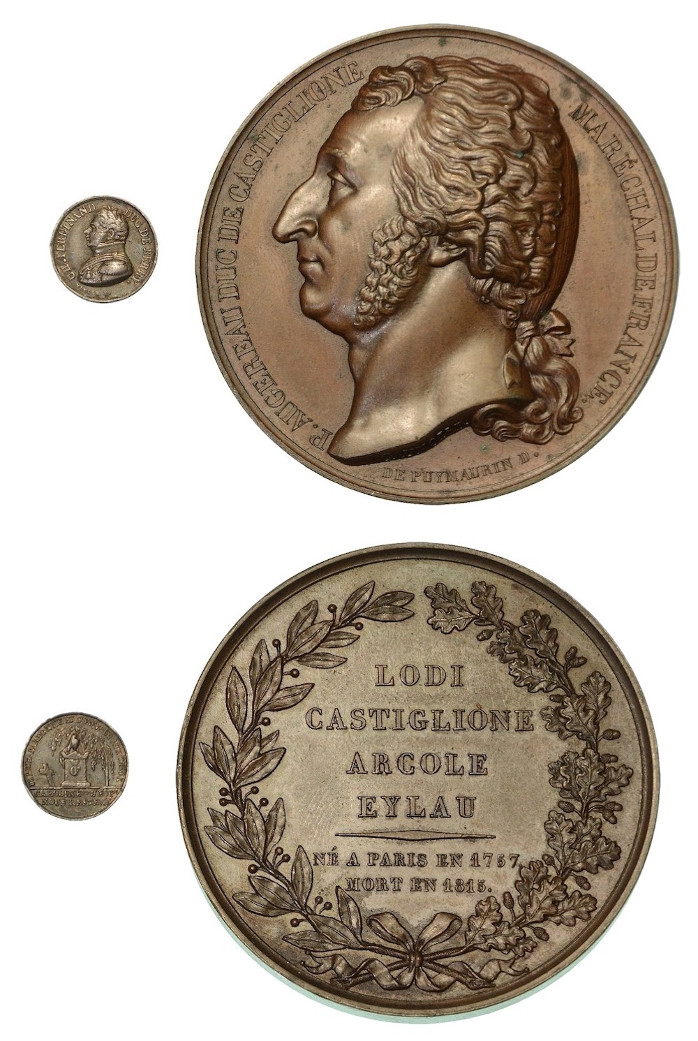 Lotto di due medaglie., MORTE DEL MARESCIALLO AUGEREAU, DUCA DI CASTIGLIONE. Medaglia in bronzo 1816. Testa a s. R/Legenda in sei righe entro rami di alloro e quercia. Opus Caunois. Bramsen 1782. Julius 3576. diam. mm. 40,6. SPL/FDC - MORTE DI CARLO FERDINANDO D'ARTOIS, DUCA DI BERRY (1778-1820). Medaglia in argento. Busto a s. R/ Monumento funebre. diam. mm. 0,9. BB