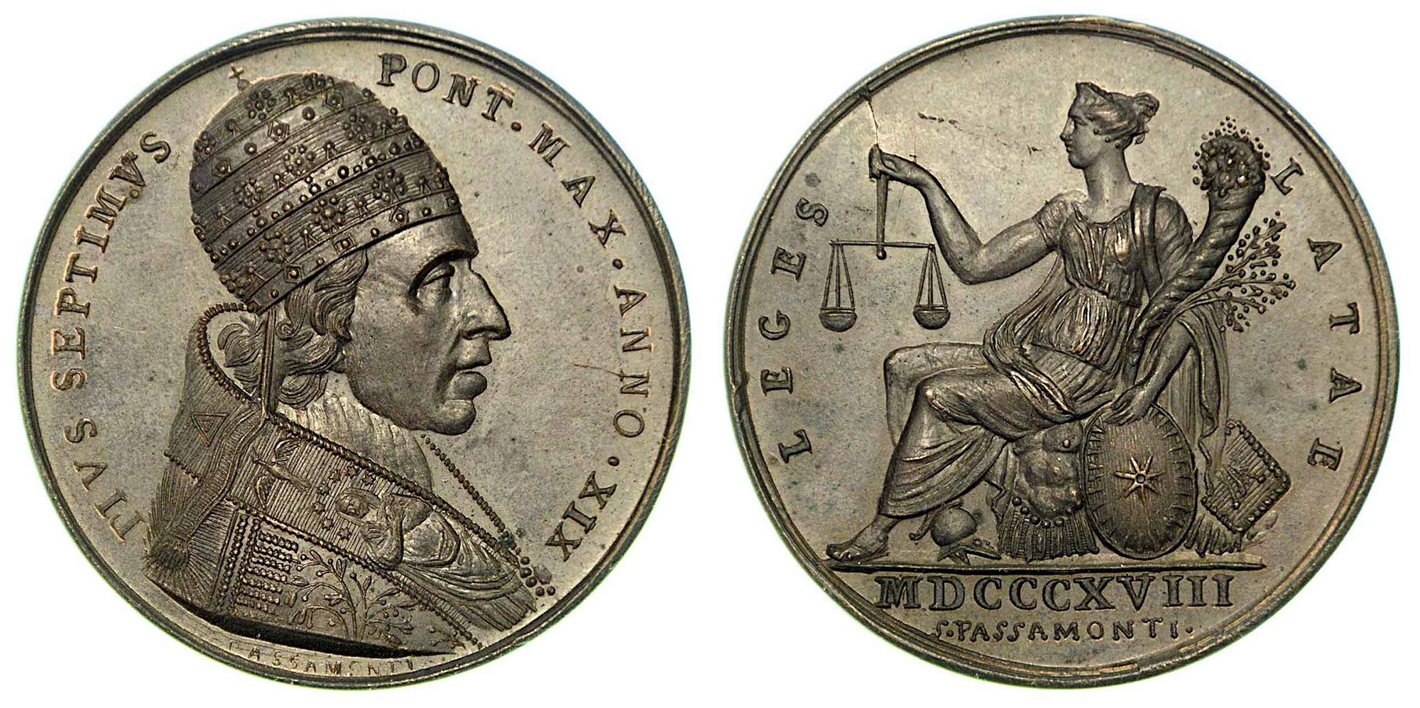 PIO VII, 1800-1823. NUOVO ASSETTO DATO AL SETTORE DELLA GIUSTIZIA., Medaglia in bronzo anno XIX (1818).