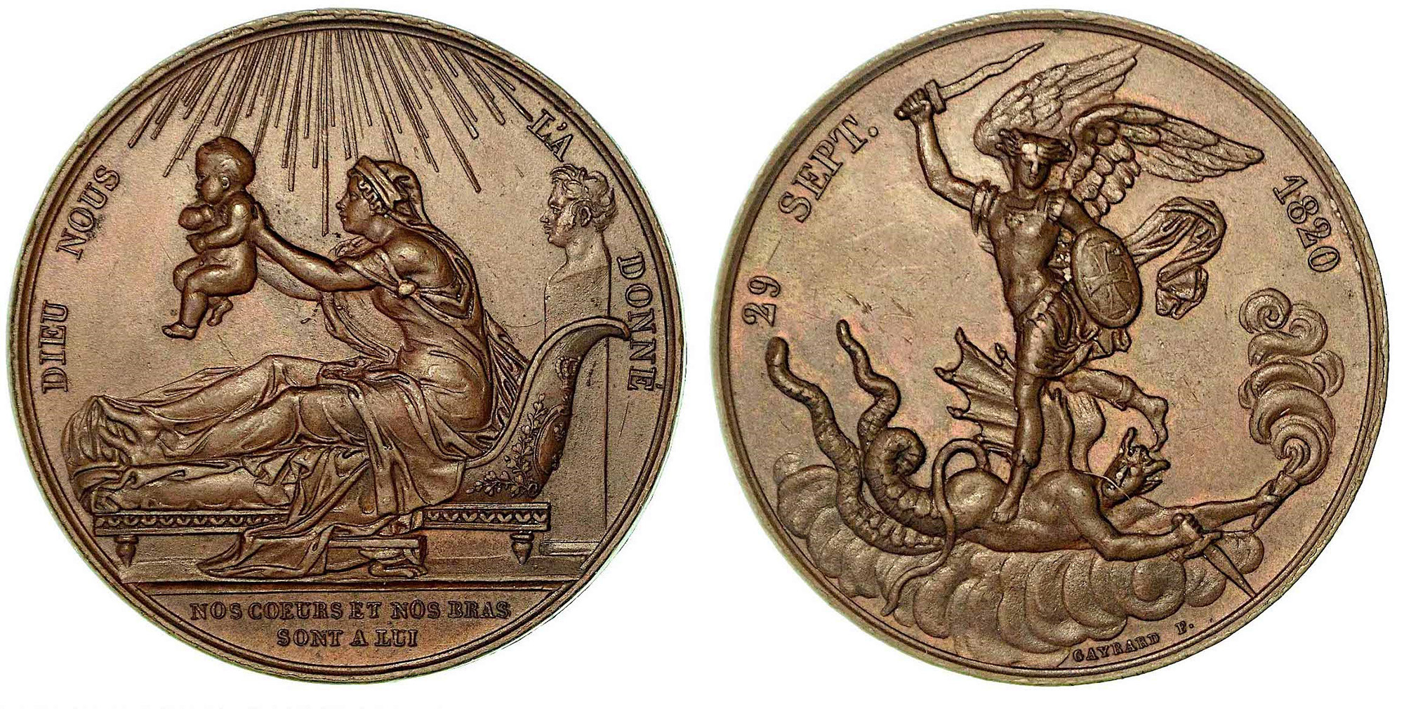 CAROLINA DI BORBONE, 1798-1870. NASCITA DEL DUCA DI BORDEAUX., Medaglia in bronzo 1820. Presentazione del Duca di Bordeaux. R/ San Michele mentre calpesta il diavolo. Opus Gayrand. diam. mm. 37,9. SPL