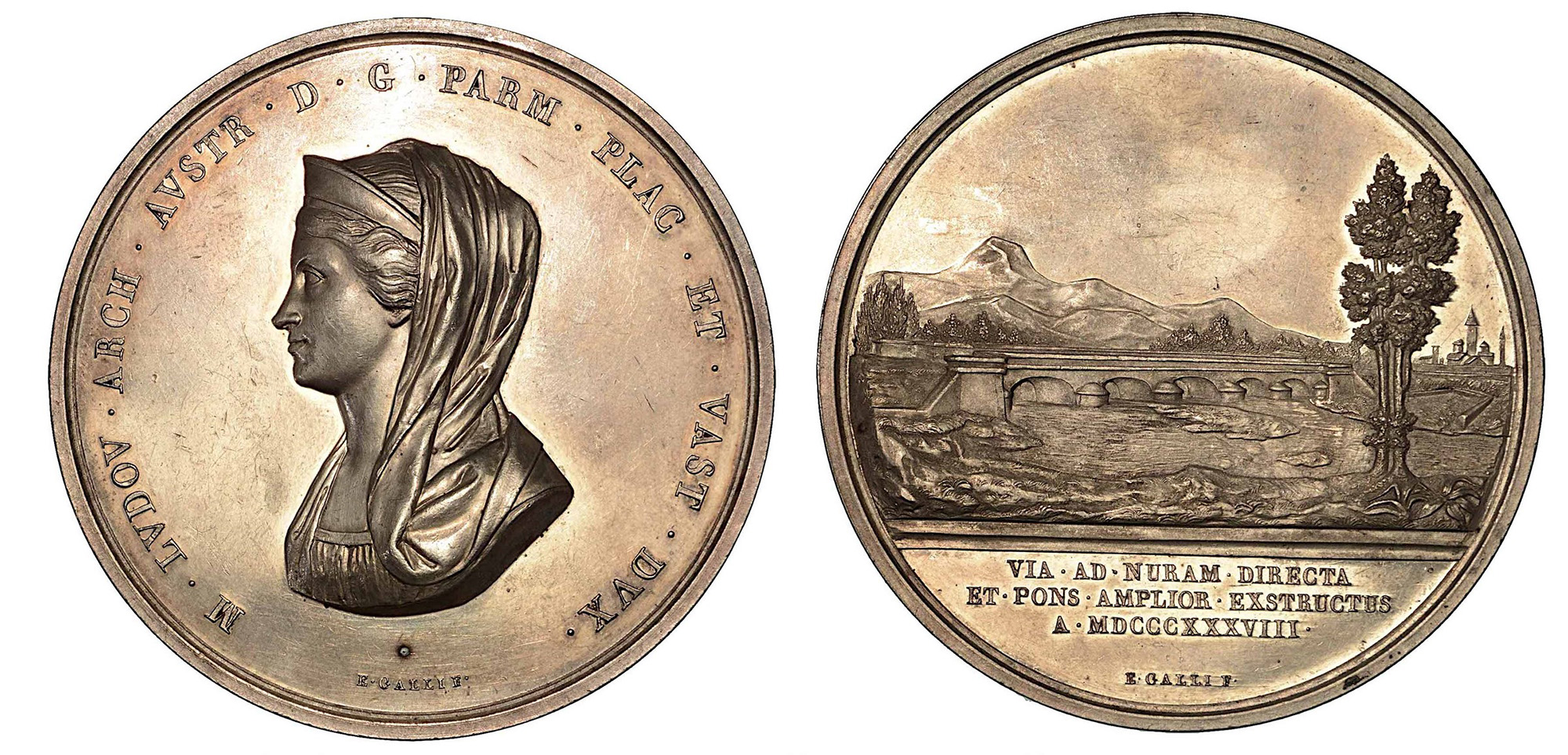 MARIA LUIGIA D'AUSTRIA, 1815-1847. PONTE SUL TORRENTE NURE., Medaglia in argento 1838. Nel centro busto a s., con diadema e velo. R/ Nel campo ponte a cinque archi sul torrente Nure. A destra in primo piano due pioppi, in lontananza Borgo di Pontenure. Nell’esergo: VIA. AD. NURAM. DIRECTA / ET. PONS. AMPLIOR. EXSTRUCTUS / A. MDCCCXXXVIII. Opus E. Galli. Coll.Johnson (Vol. V p. I), 1194. Bramsen 1976. Julius 3983f. diam. 56,3 mm. SPL/FDC