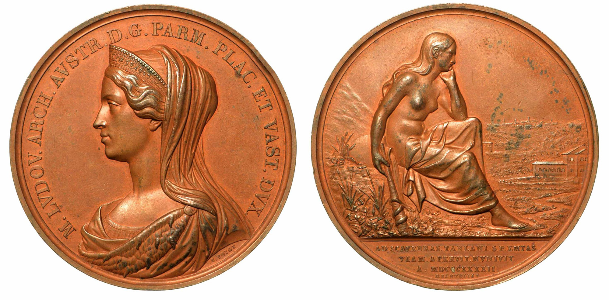 MARIA LUIGIA D'AUSTRIA, 1815-1847. STRADA DA BORGO S. DONNINO AI BAGNI DI TABIANO., Medaglia in bronzo 1842. Nel centro busto a s. con diadema, velo e manto d’ermellino. R/ Nel campo figura di donna seduta a destra con i capelli sciolti, che tiene nella mano destra il bastone di Esculapio e un otre dal quale esce acqua che scorre verso l'edificio delle Terme di Tabiano. In fondo le case di Borgo S. Donnino (Fidenza). Nell’esergo: AD. SCATEBRAS. TABLANI. S. (sua) P. (pecunia) EMTAS / VIAM. APERVIT. MVNIVIT / A. MDCCCXXXXII. Opus C. Voigt/D. Bentelli. Coll. Johnson (Vol. V p. I), 1199. Camozzi Vertova, 507. diam. 56 mm. SPL