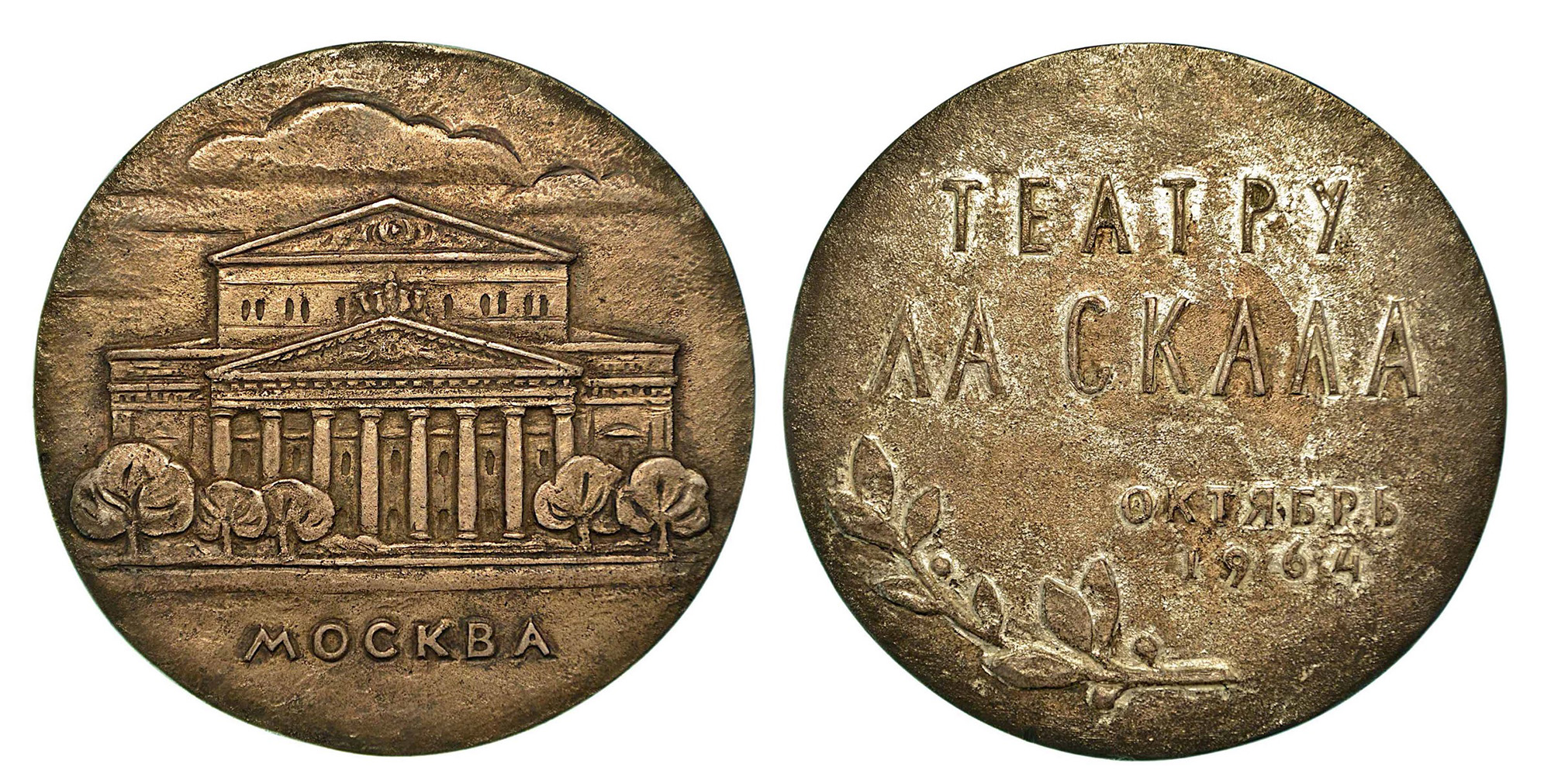 RUSSIA. Mosca., Medaglia in piombo per la rappresentazione de "Il Trovatore" effettuata dalla compagnia del Teatro alla Scala al Bolshoi. Teatro Bolshoi. R/ Teatro alla Scala; ottobre 1964; corone d'alloro. diam. mm. 89. BB