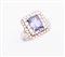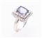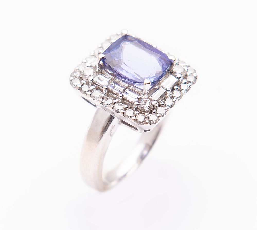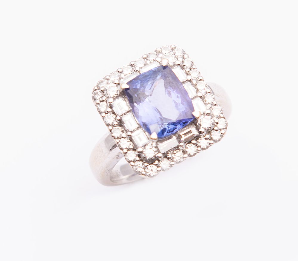 ANELLO IN ORO BIANCO, TANZANITE E DIAMANTI. Realizzato con tanzanite sfaccettata posta entro doppia cornice di diamanti rotondi e a baguette. Peso complessivo: 9,06 grammi.