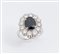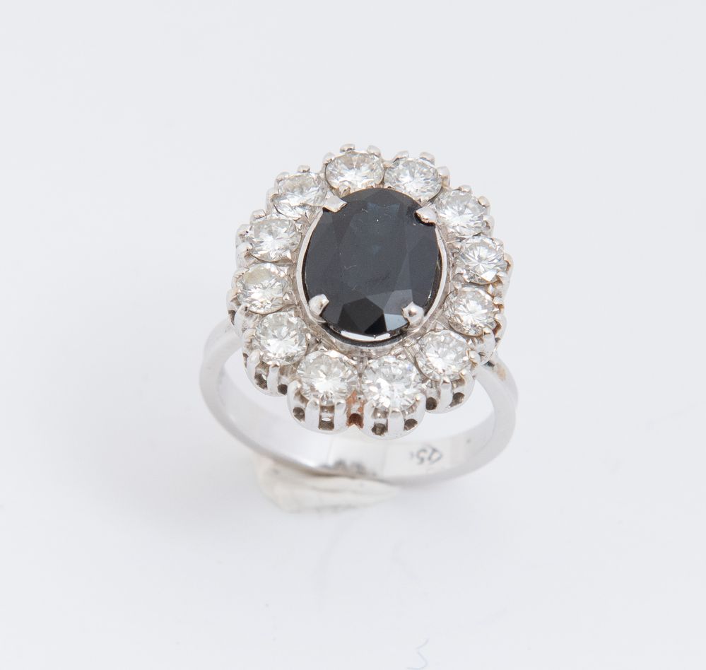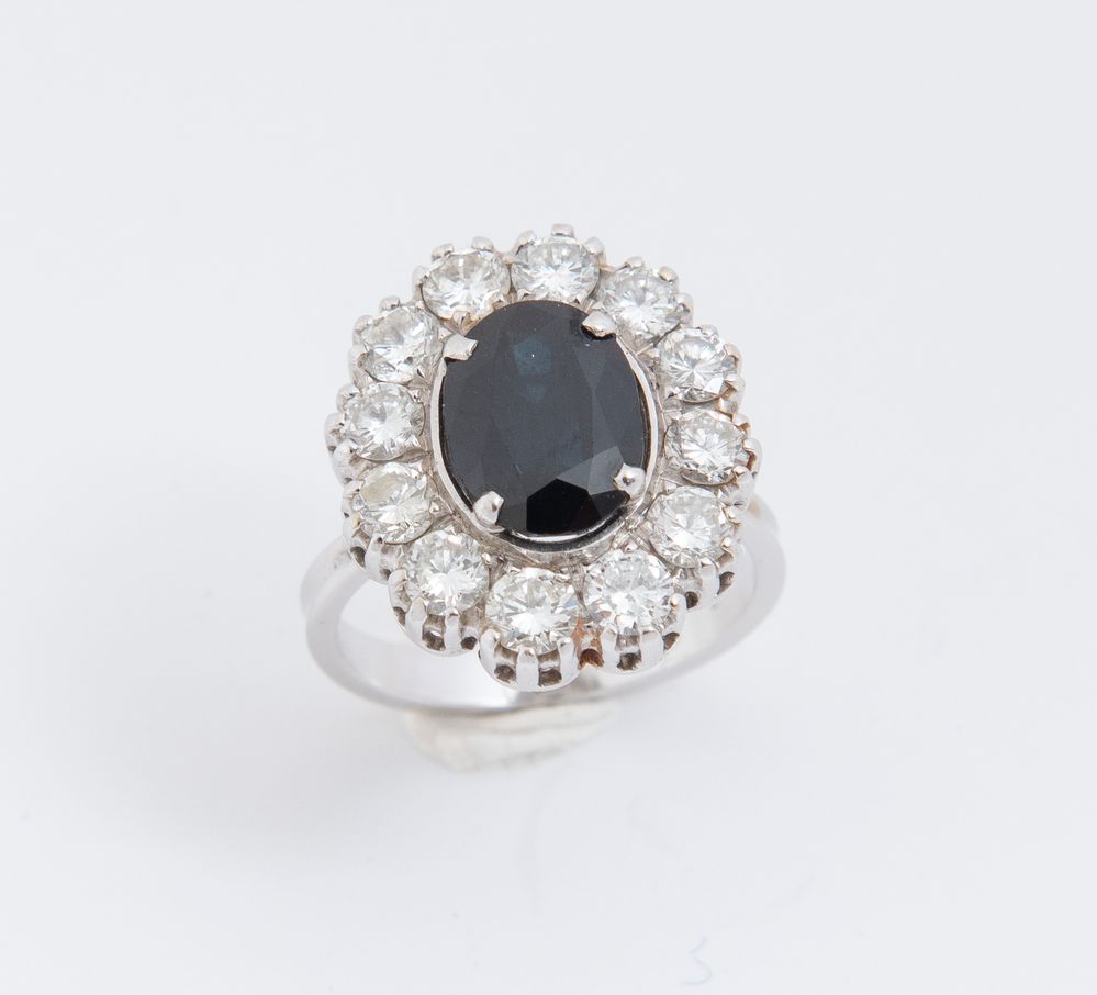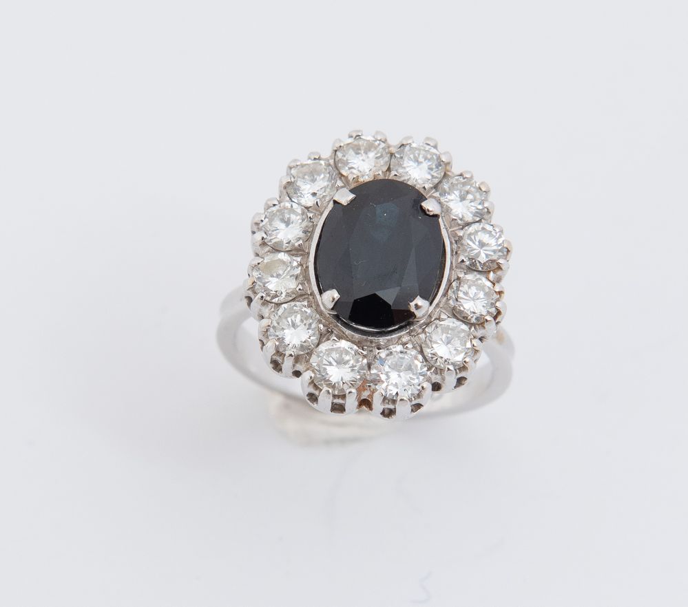 ANELLO IN ORO BIANCO, ZAFFIRO E DIAMANTI Realizzato con zaffiro ovale centrale entro cornice di diamanti a brillante (peso stimato 1,20 ct). Peso complessivo: 6,70 grammi.