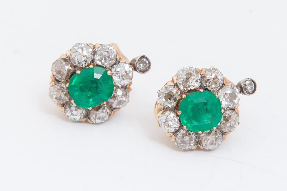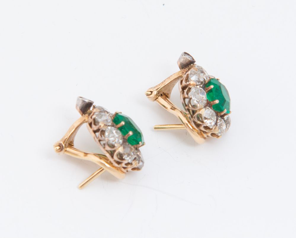 ORECCHINI IN ORO 18K CON SMERALDI E DIAMANTI ciascuno realizzato come una clip centrata da smeraldo colombiano ottagonale posto entro cornice diamanti di vecchio taglio; peso stimato degli smeraldi 2.50 ct circa, peso stimato dei diamanti 3.40 ct circa. Peso complessivo: 7,10 grammi.