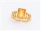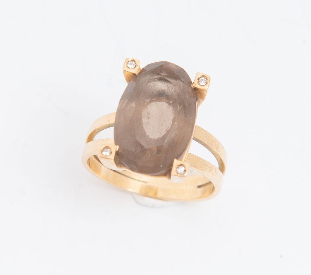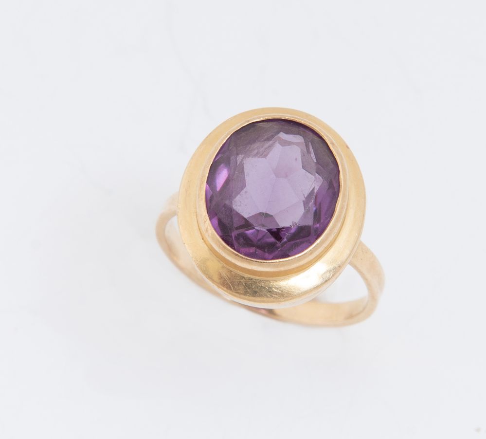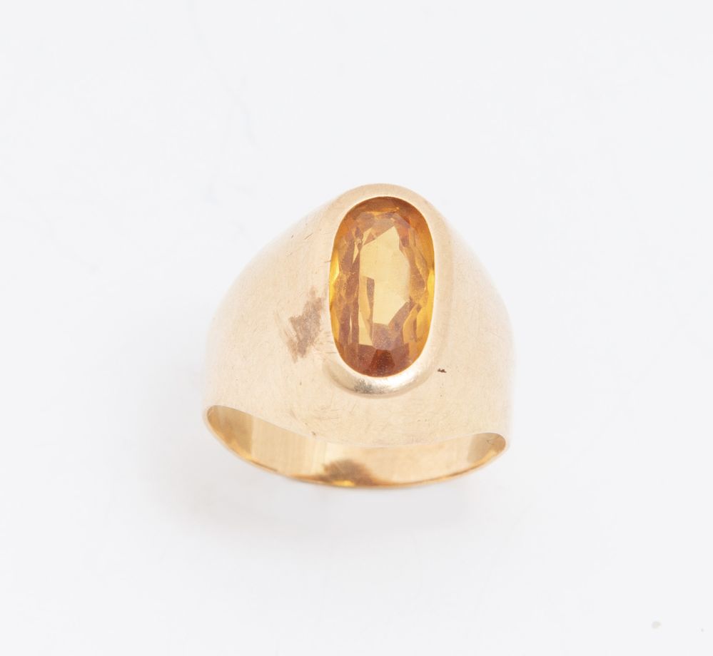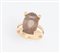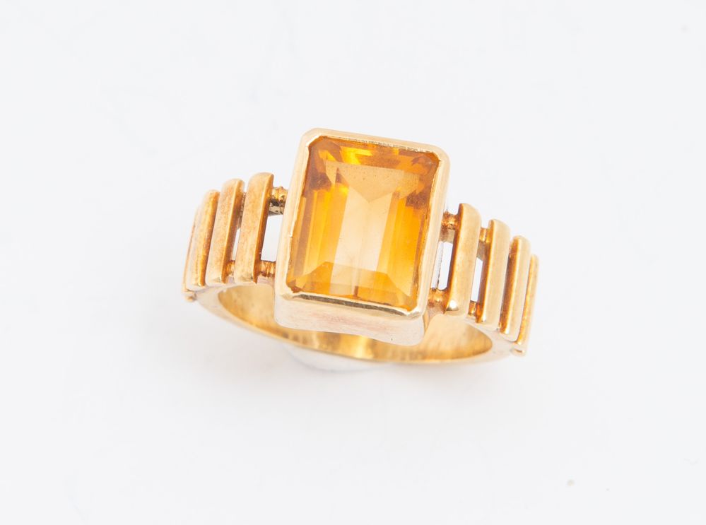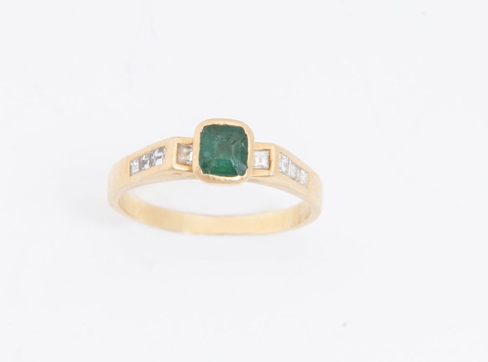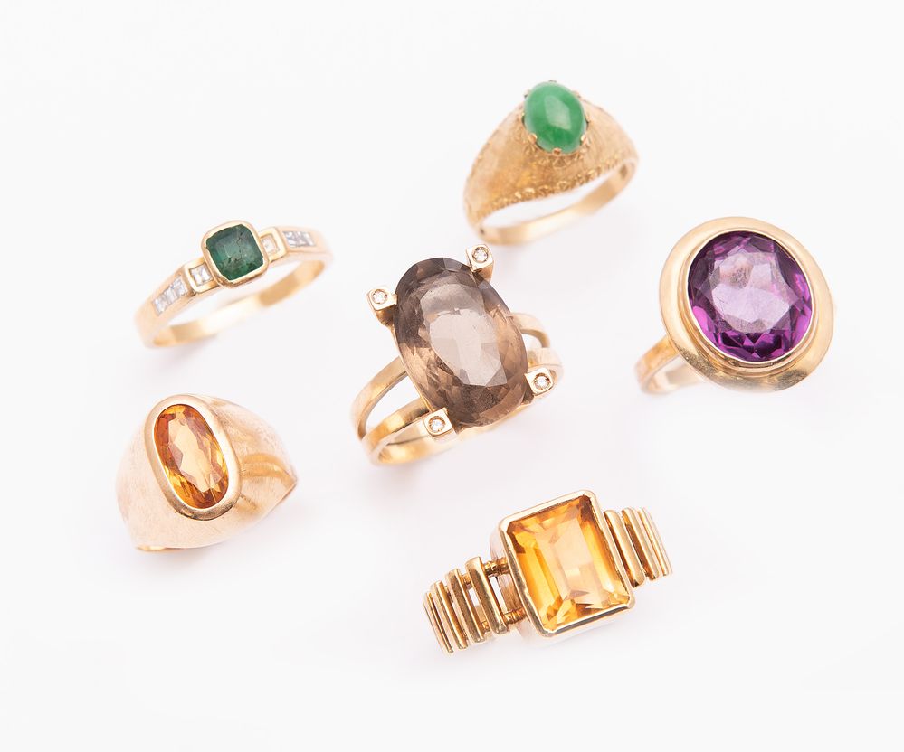 LOTTO DI SEI ANELLI. In oro giallo, ciascuno decorato con pietre ornamentali e preziose, tra cui quarzi, smeraldo e piccoli diamanti. Peso complessivo: 34,27 grammi.