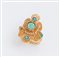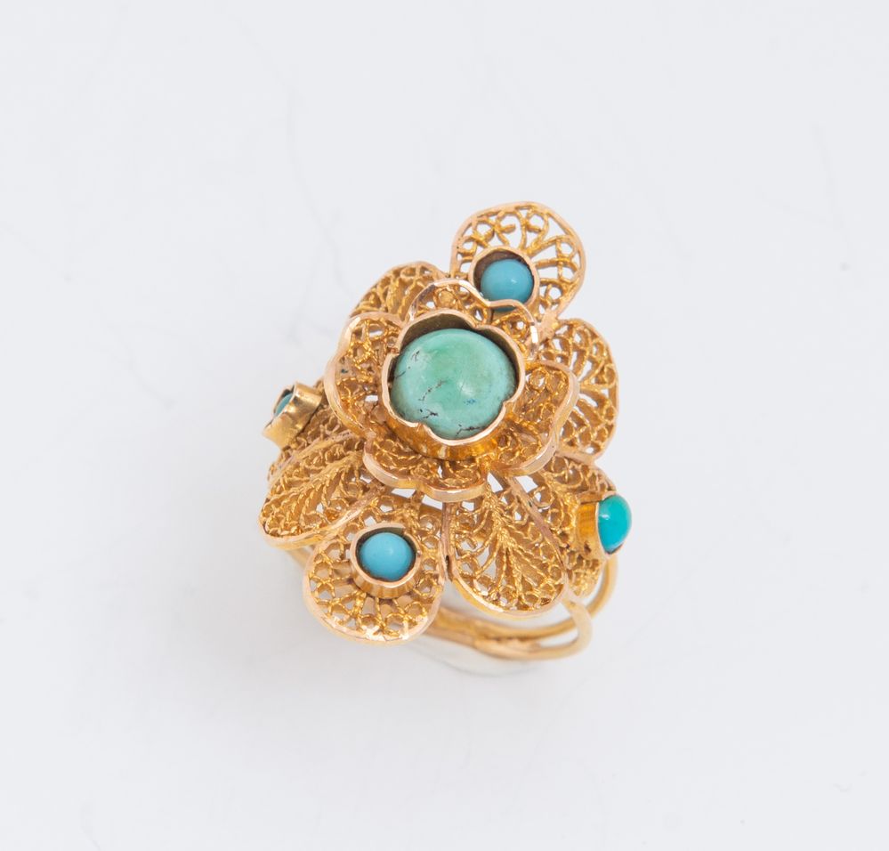 ANELLO IN ORO GIALLO E TURCHESI Lavorato a filigrana e decorato con piccoli...