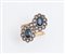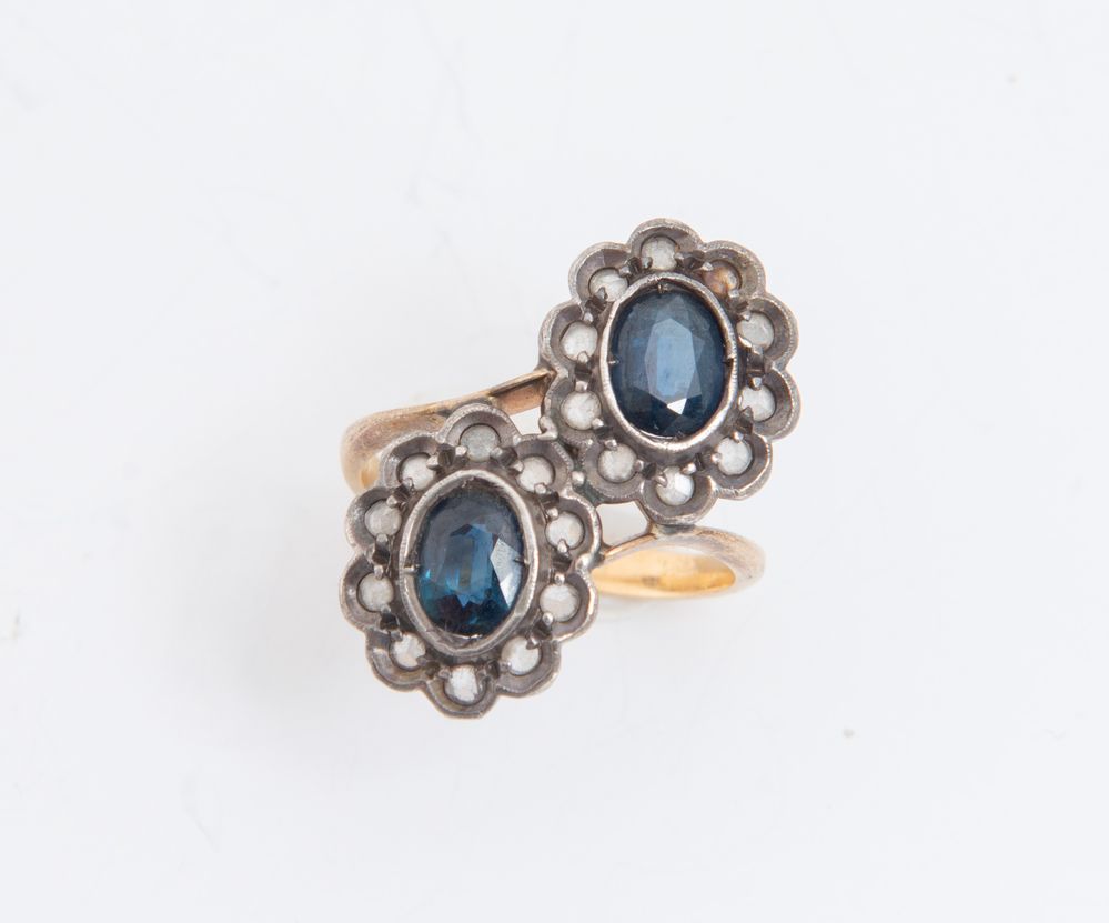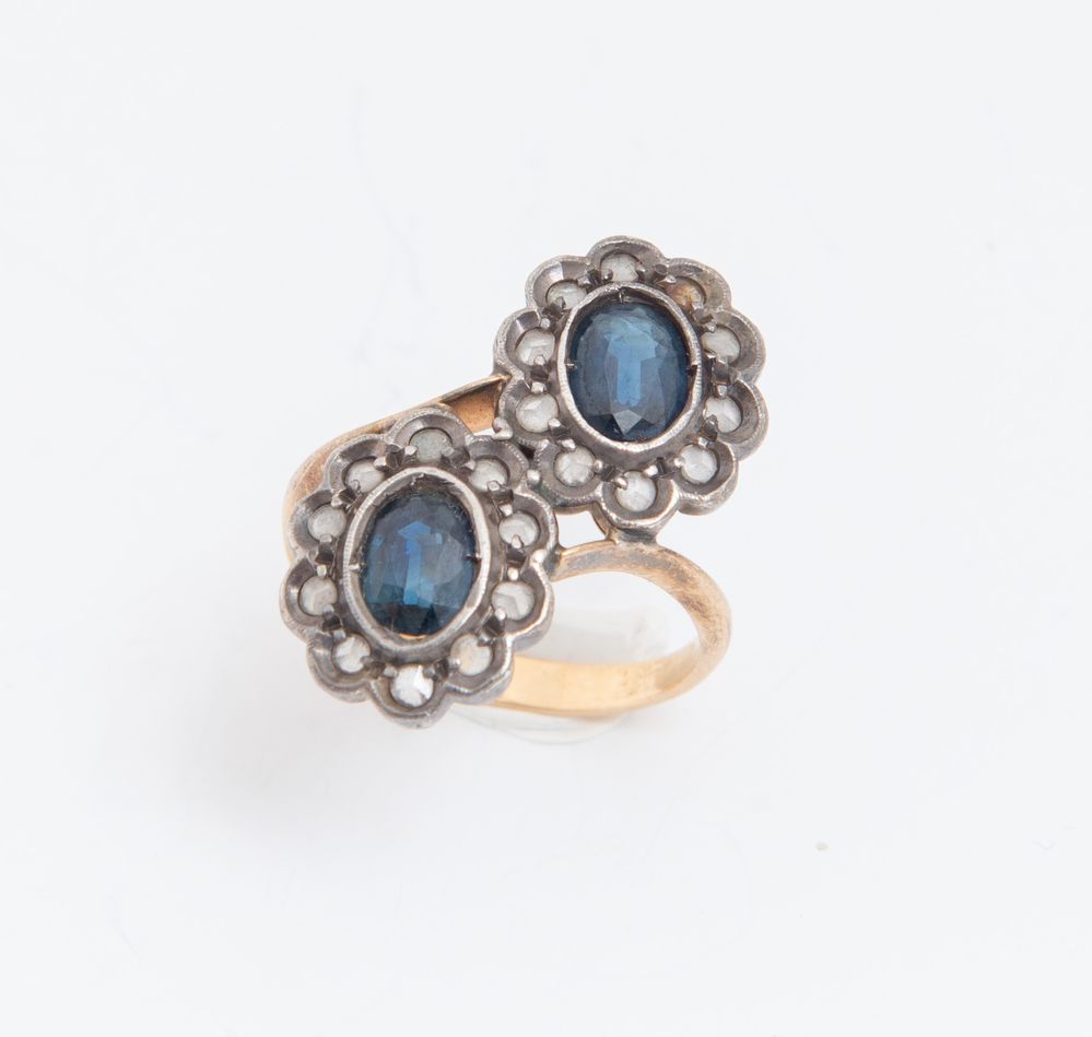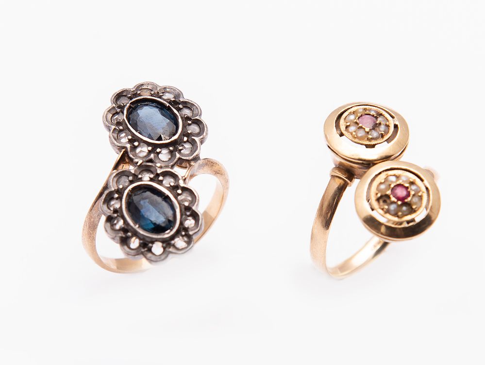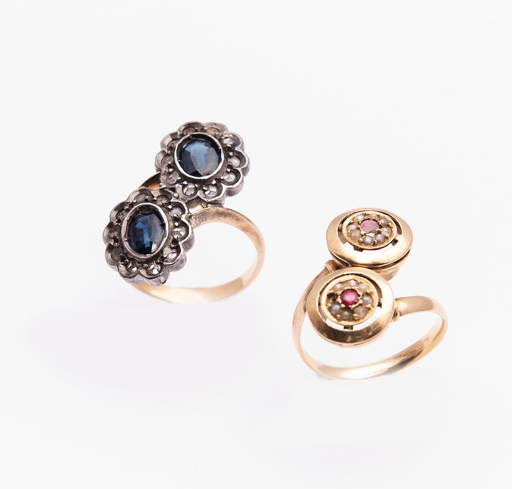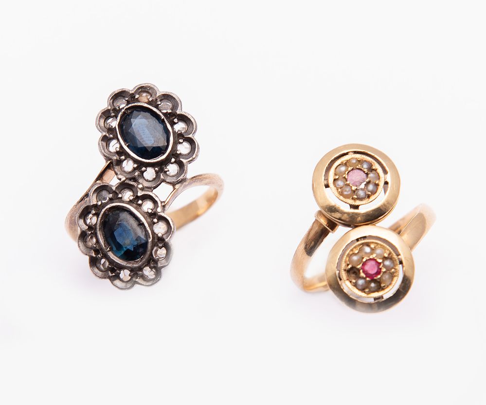 LOTTO DI DUE ANELLI. Ciascuno realizzato come un contrarié con rubini e zaffiri legati in oro e argento. Peso complessivo: 10,13 grammi.