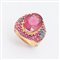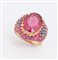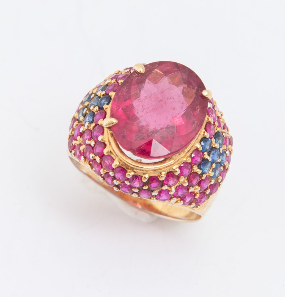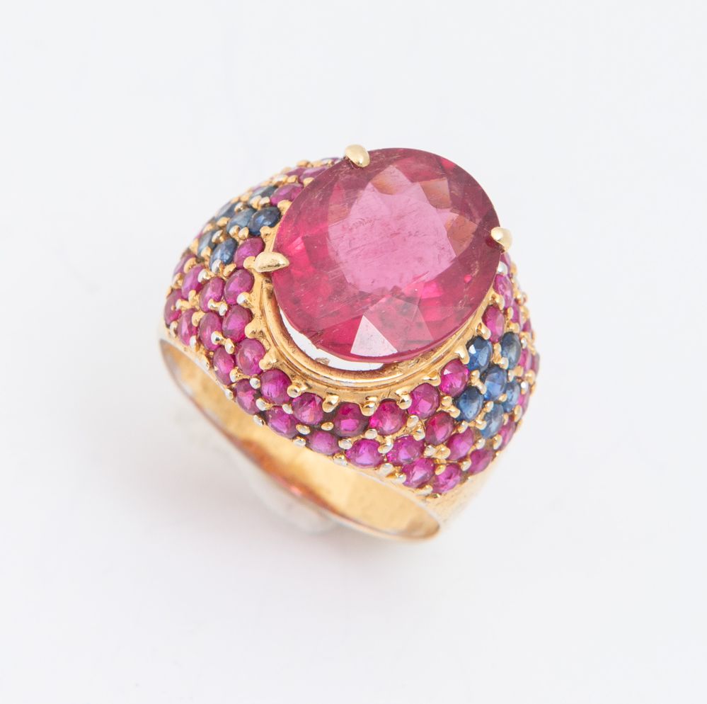 ANELLO IN ORO, TORMALINA, RUBINI E ZAFFIRI. Realizzato come una fascia larga centrata da tormalina rubellite ovale entro pavé di rubini e zaffiri. Mancanze. Peso complessivo: 9,77 grammi.