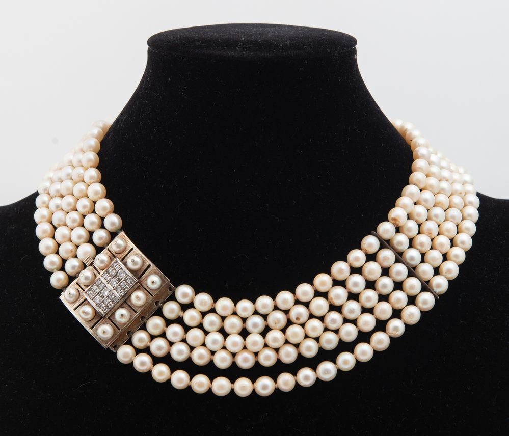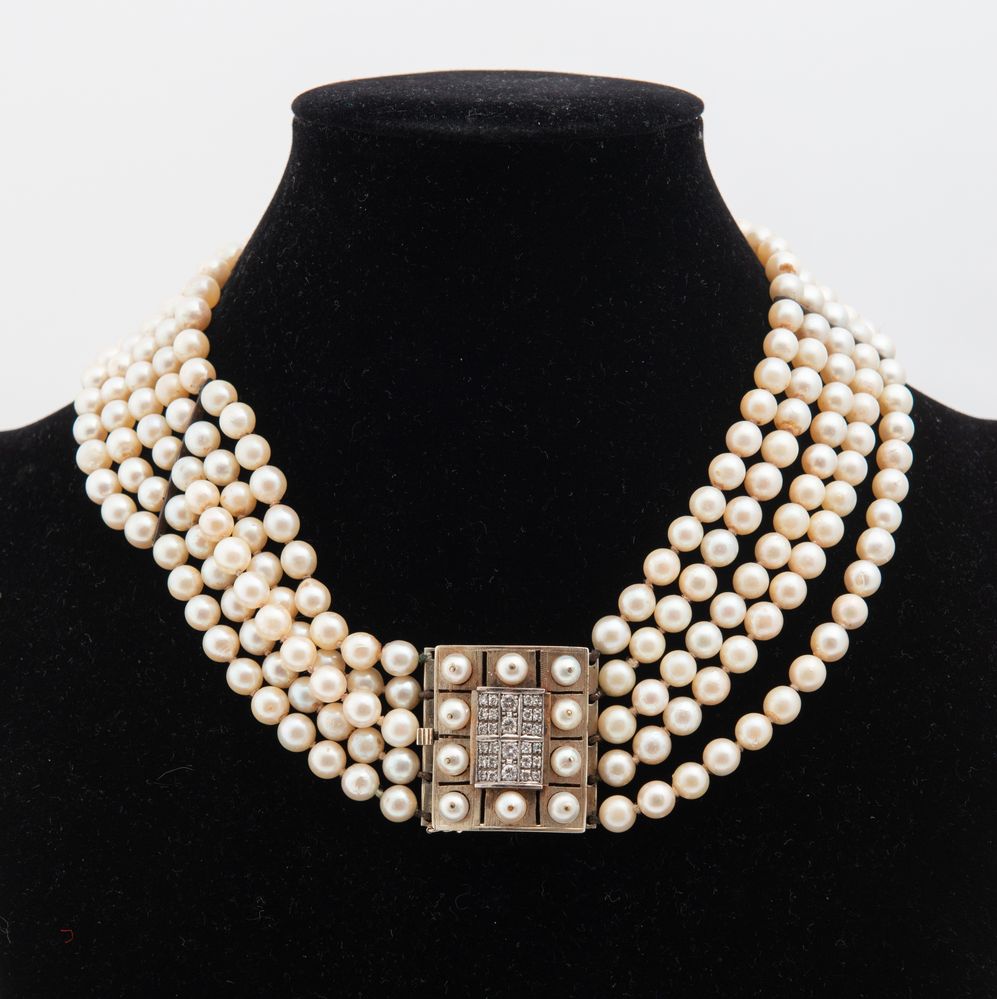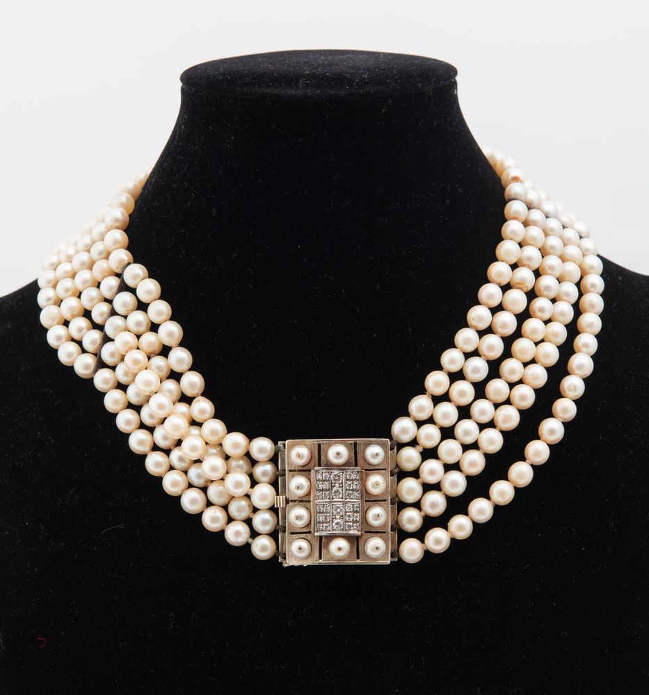 COLLANA DI PERLE a cinque fili di perle coltivate crema (7mm diametro, portano segni di invecchiamento), centrata da grande chiusura in oro bianco decorata con perle e piccoli diamanti. Peso complessivo 159,59 grammi.
