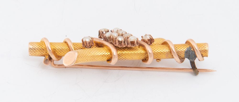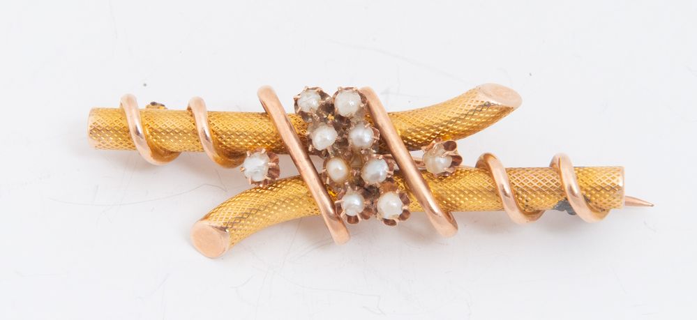 SPILLA IN ORO GIALLO. Realizzata come un doppio tralcio decorato con microperle. Peso complessivo: 4,38 grammi.