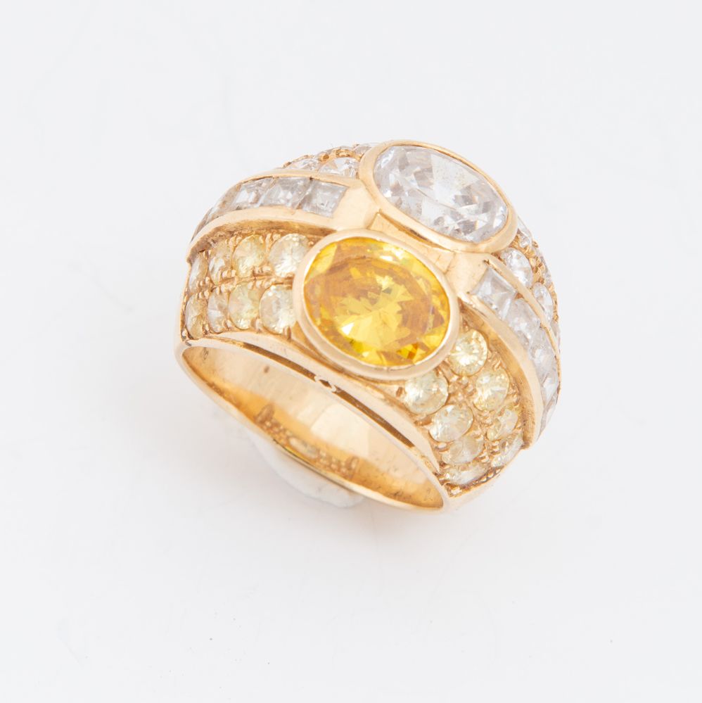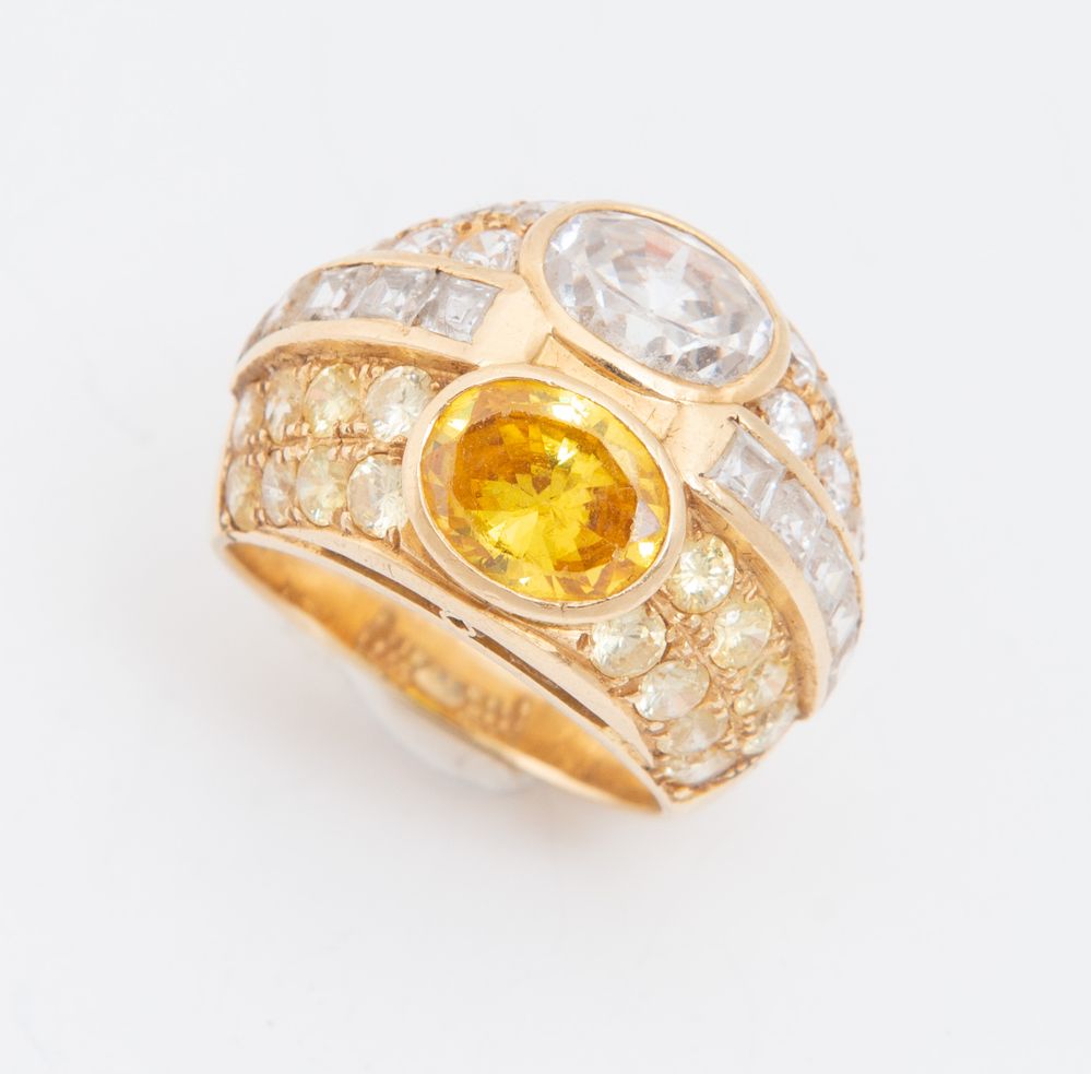 ANELLO IN ORO. Realizzato come una fascia larga decorata con gemme ad imitazioni di diamante. Peso complessivo: 20,19 grammi.