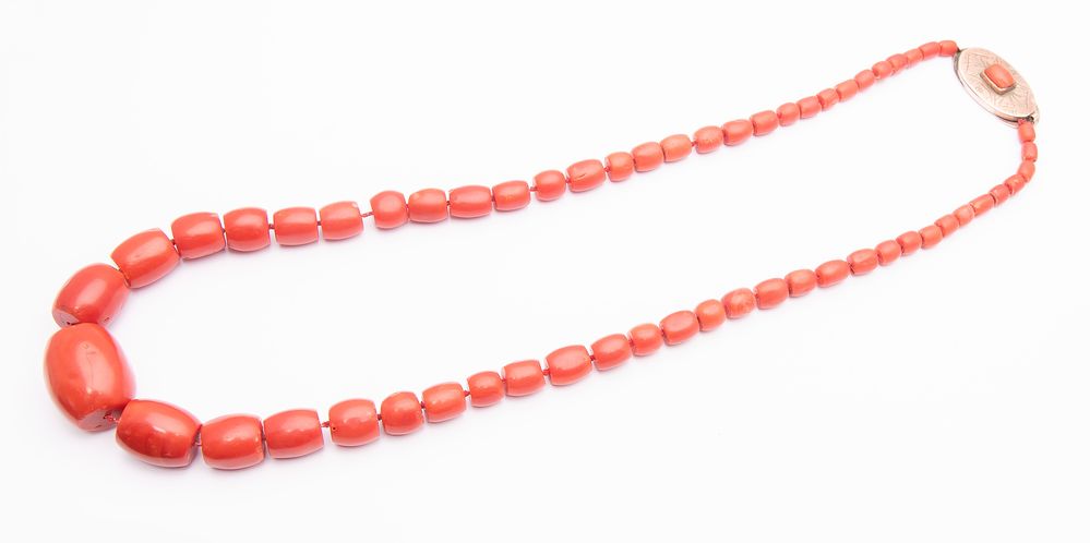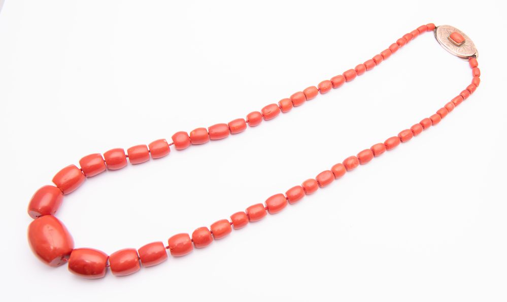 COLLANA IN CORALLO ROSSO Realizzata ad una fila di barilotti in corallo rosso mediterraneo levigato, fermezza in oro a basso titolo cesellato e centrata da cabochon di corallo. Peso complessivo 166,31 grammi.