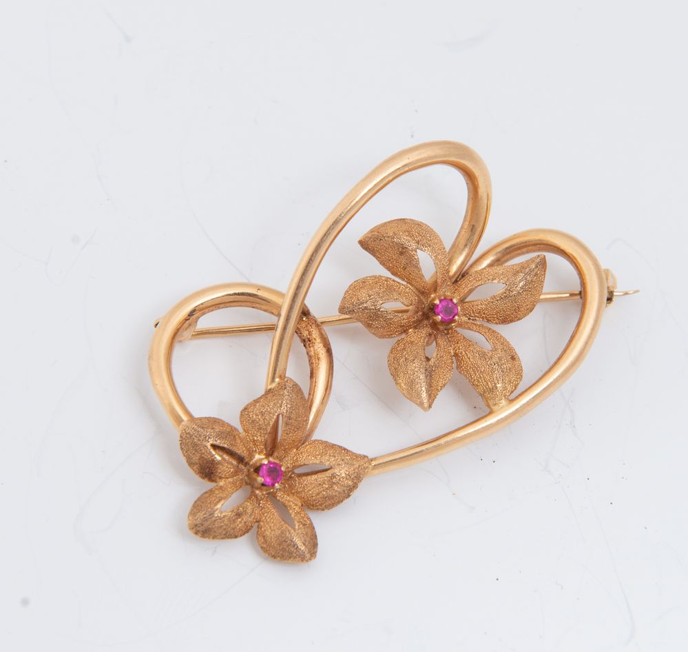 SPILLA IN ORO A doppio motivo floreale in oro giallo 18K, pistilli in rubini sintetici. Peso complessivo: 7,42 grammi.