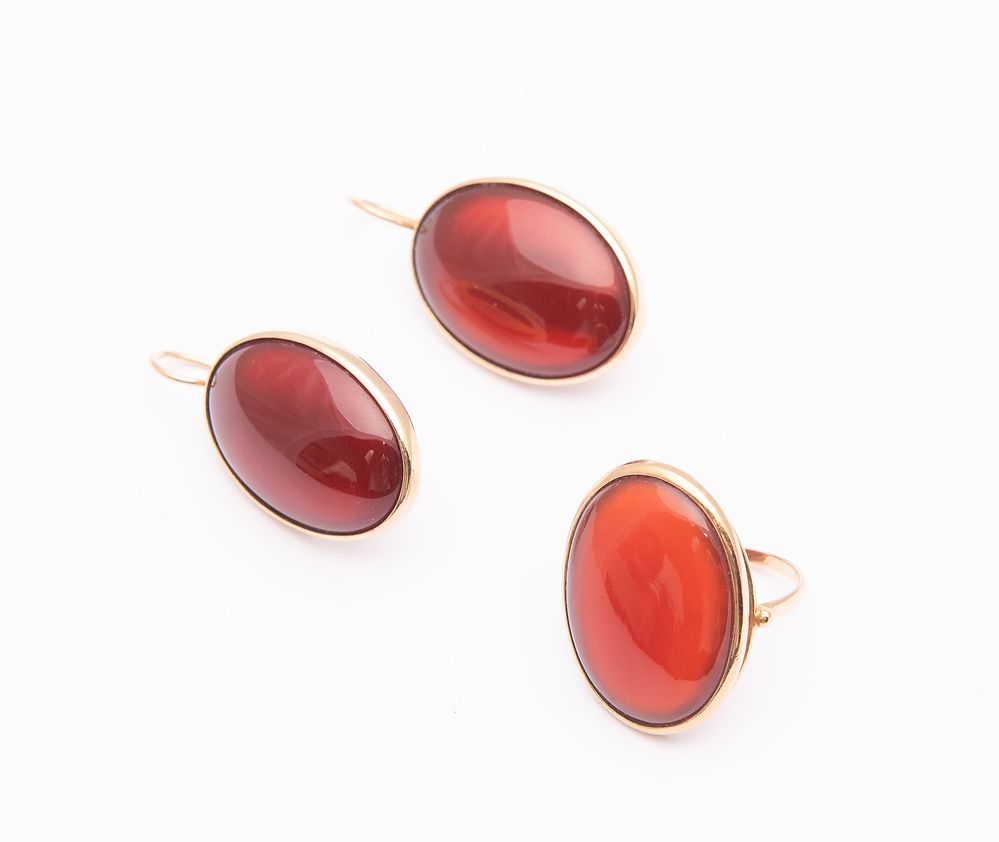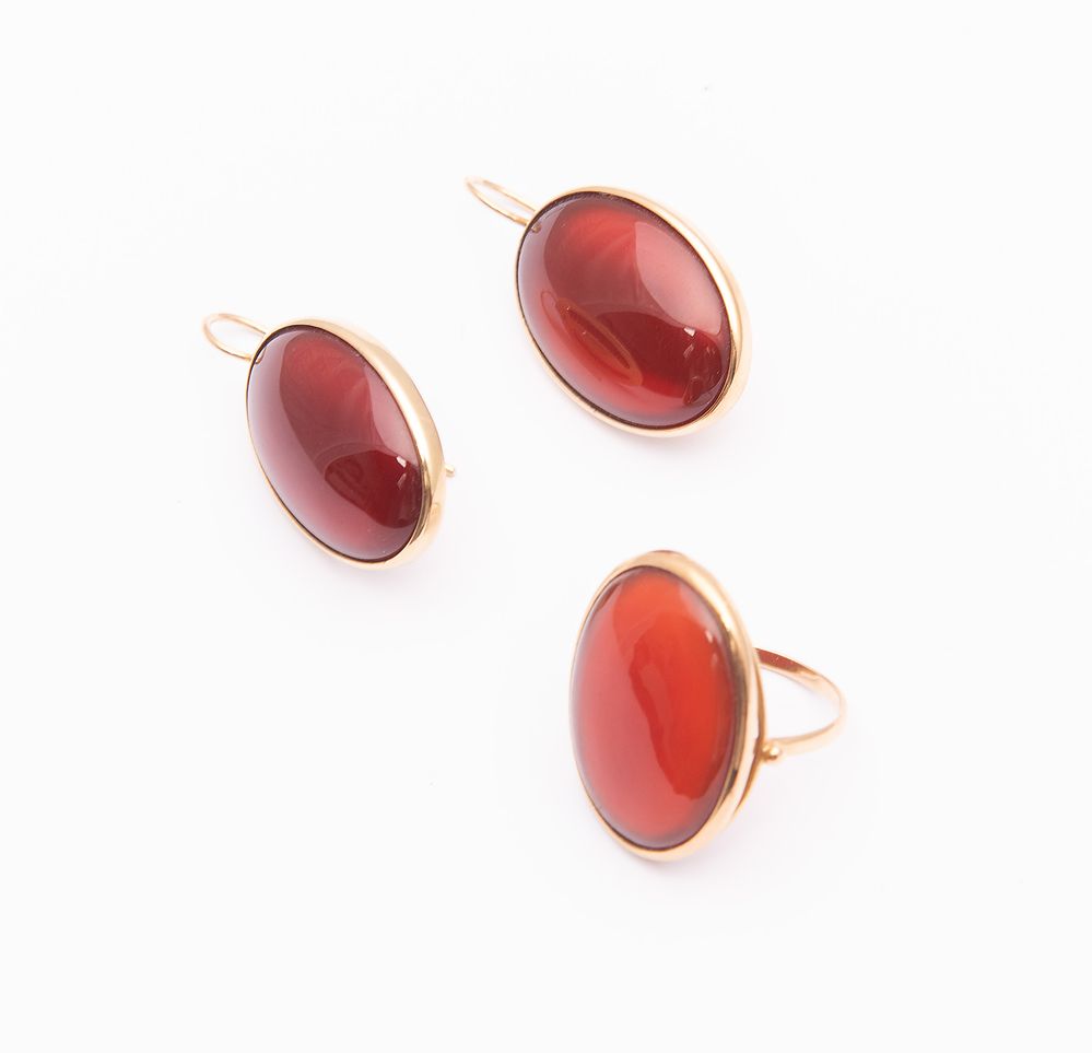 DEMIPARURE IN ORO E CORNIOLA. Costituita da anello e orecchini a monechella, ciascuno centrato da cabochon ovale di corniola legato in oro giallo. Peso complessivo: 20,60 grammi.