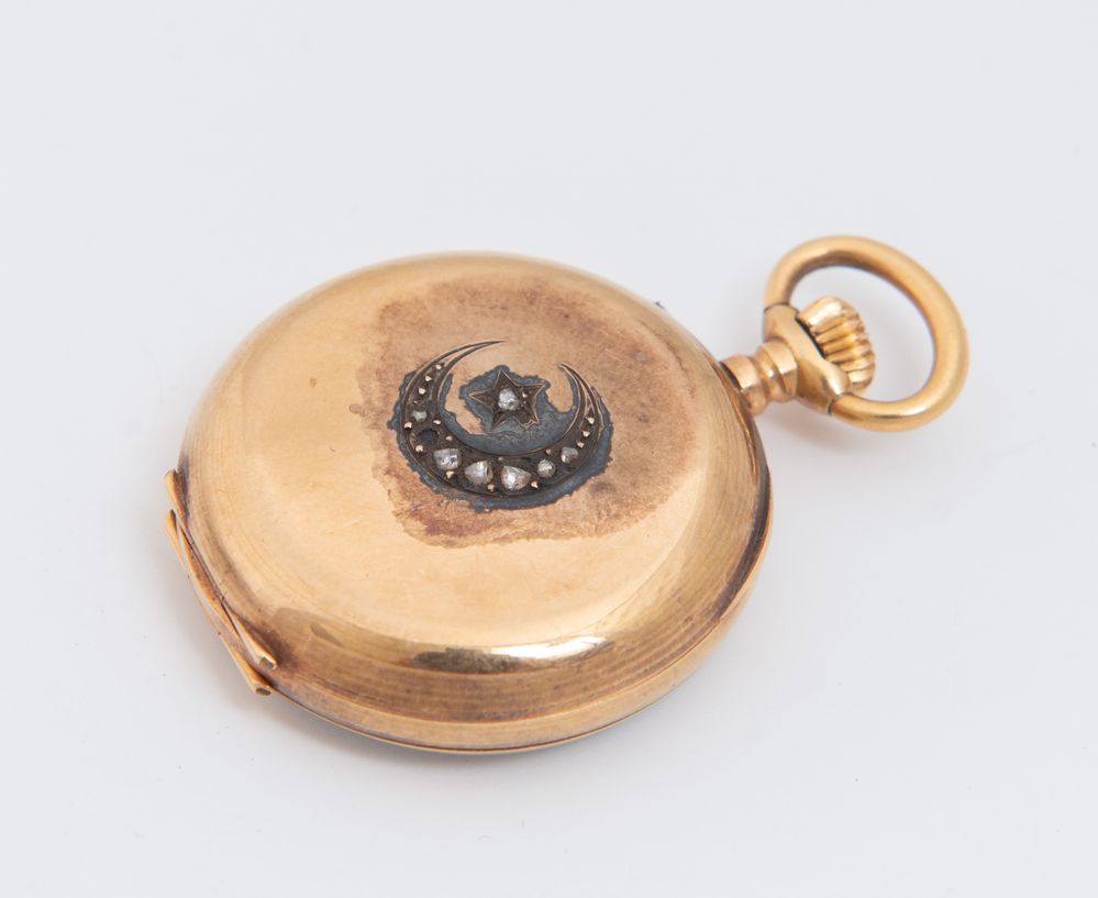 OROLOGIO DA TASCA In oro giallo, quadrante smaltato bianco con indici romani, decorato al retro con mezzaluna in piccole rose di diamante. Peso complessivo: 21,75 grammi.