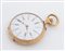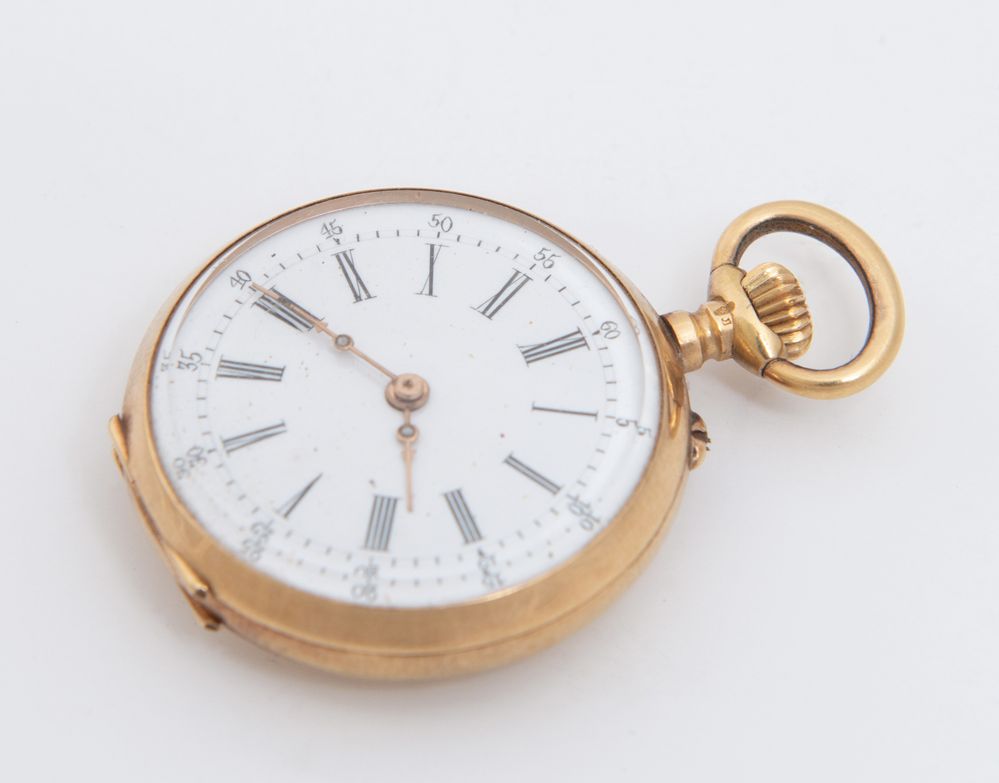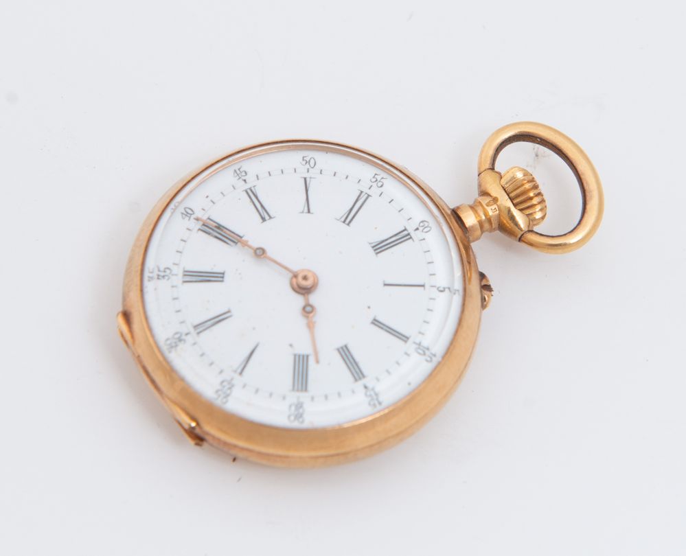 OROLOGIO DA TASCA In oro giallo, quadrante smaltato bianco con indici romani,...
