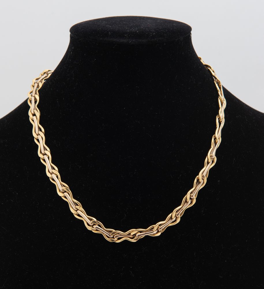 COLLANA IN ORO GIALLO E BIANCO. Realizzata come un collier articolato in maglie snodate nei due colori dell’oro. Peso complessivo: 27,12 grammi.