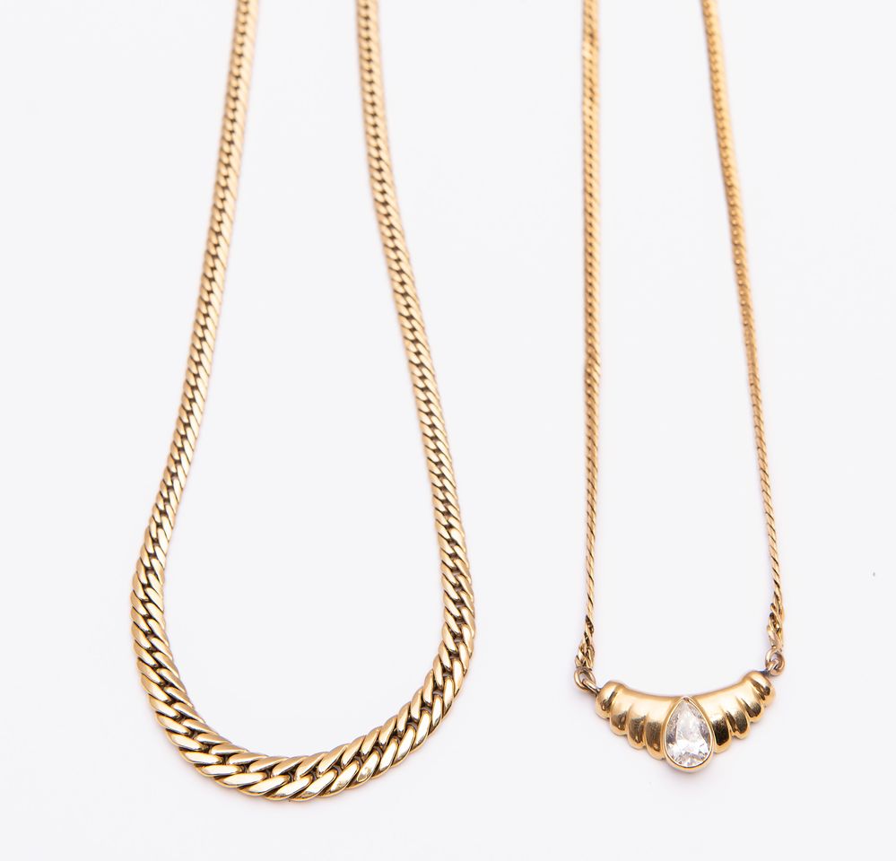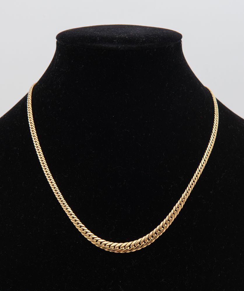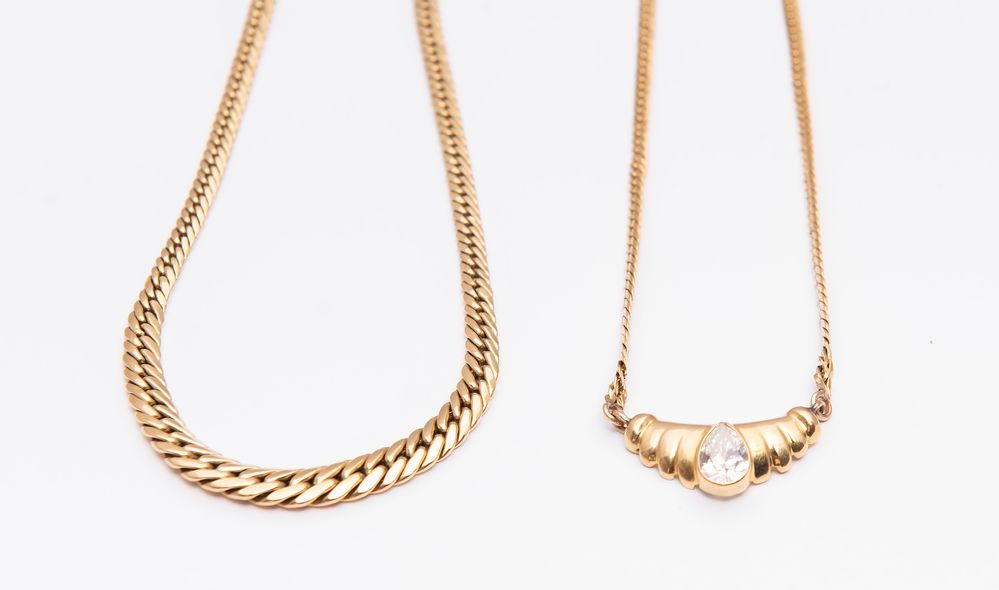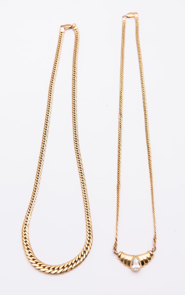 DUE COLLANE IN ORO GIALLO. Ciascuna realizzata come un collier a maglie piatte in oro giallo. Peso complessivo: 20,02 grammi.