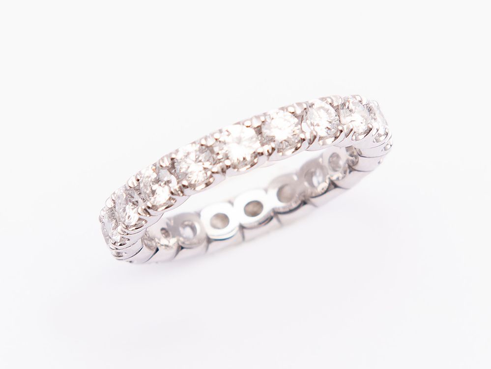 ANELLO IN ORO BIANCO E DIAMANTI. Realizzato ad una fila a tutto giro di diamanti rotondi per un peso complessivo di circa 2 carati. Peso complessivo: 4,62 grammi.