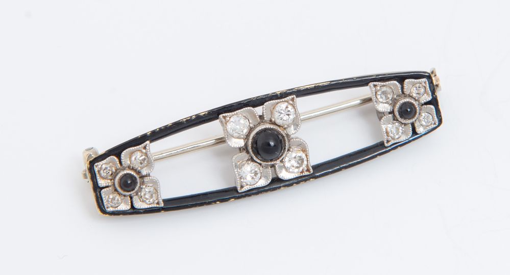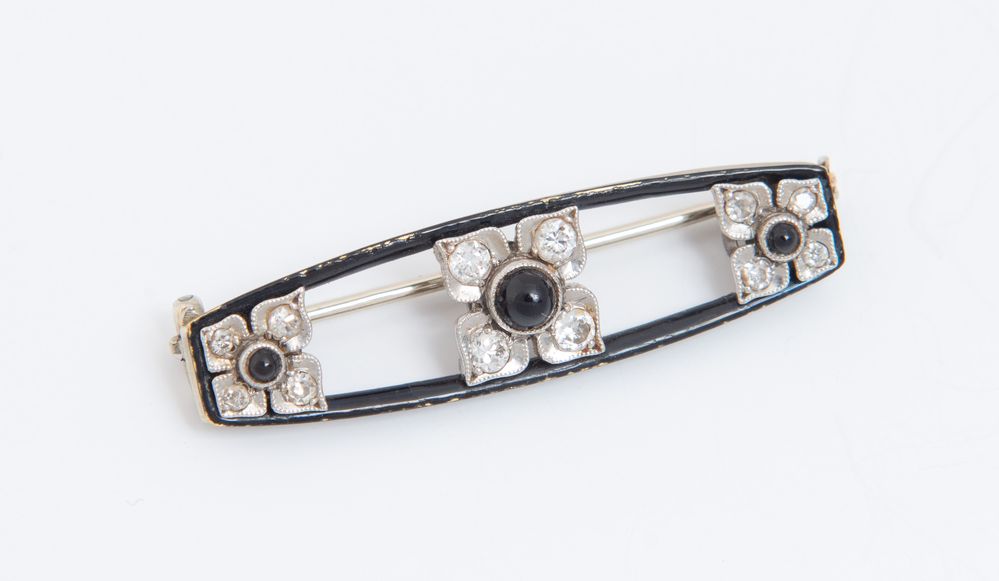 SPILLA IN ORO, SMALTO E DIAMANTI. In oro bianco 18K, a sagoma geometrica,...