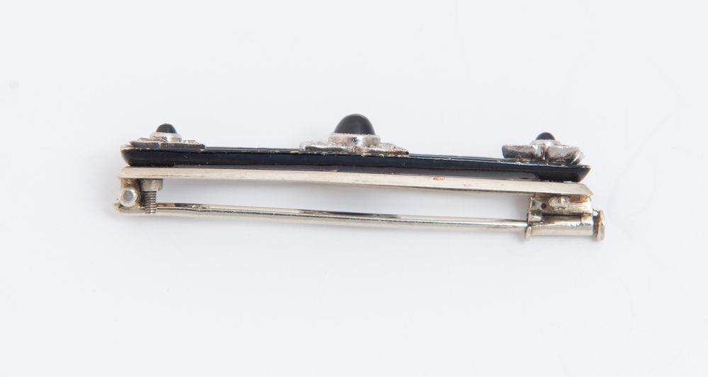 SPILLA IN ORO, SMALTO E DIAMANTI. In oro bianco 18K, a sagoma geometrica, decorata con smalto nero e diamanti per 0.40 ct totali. Peso complessivo: 7,50 grammi.