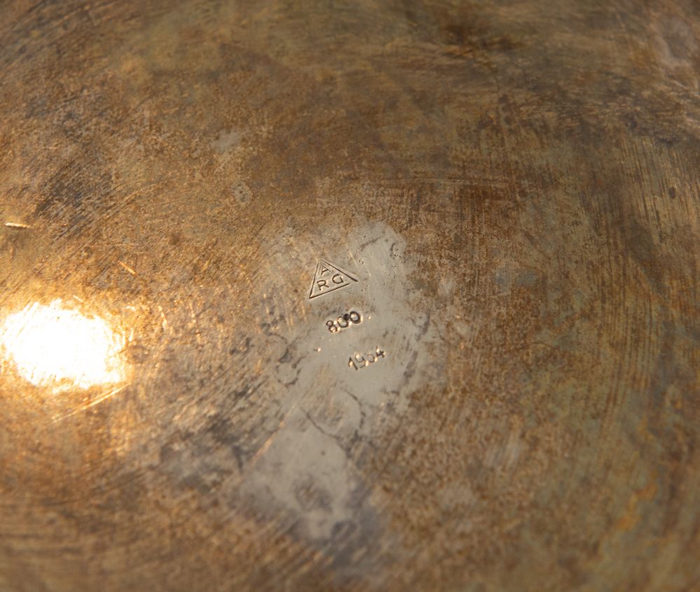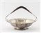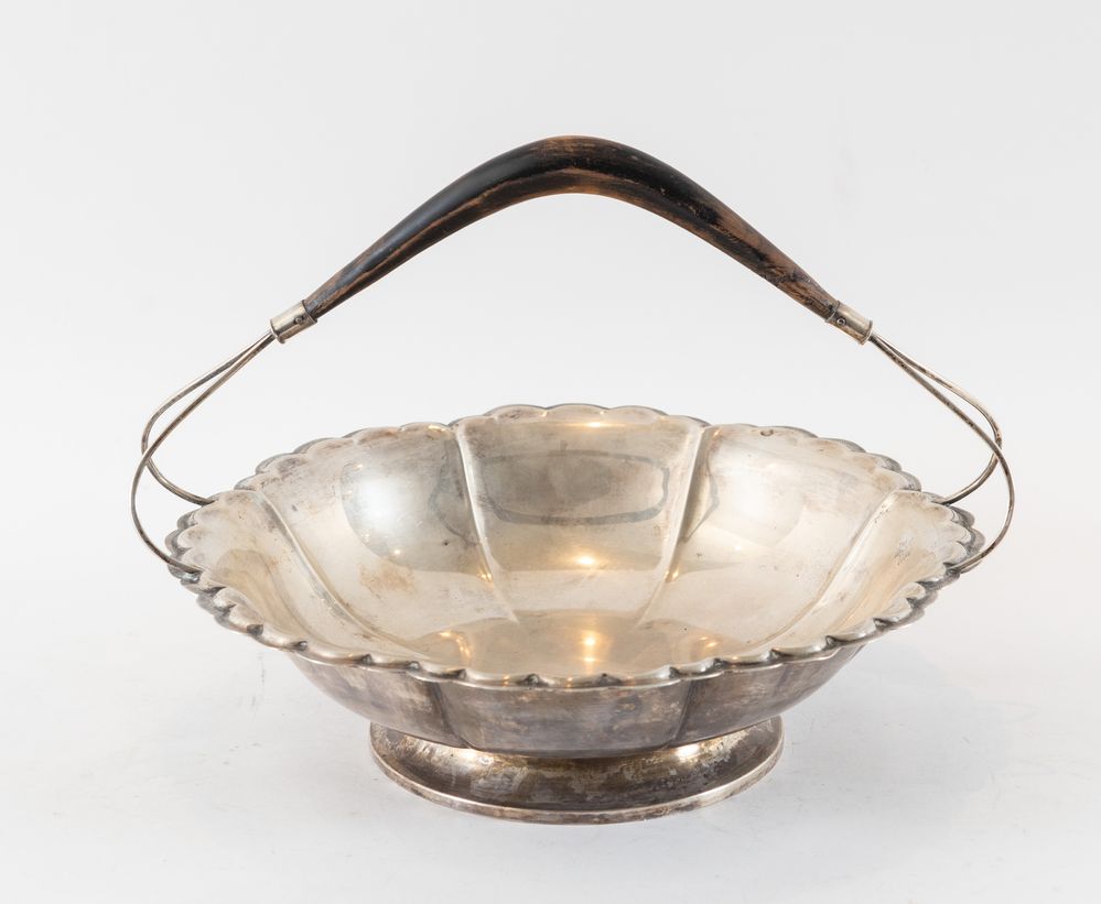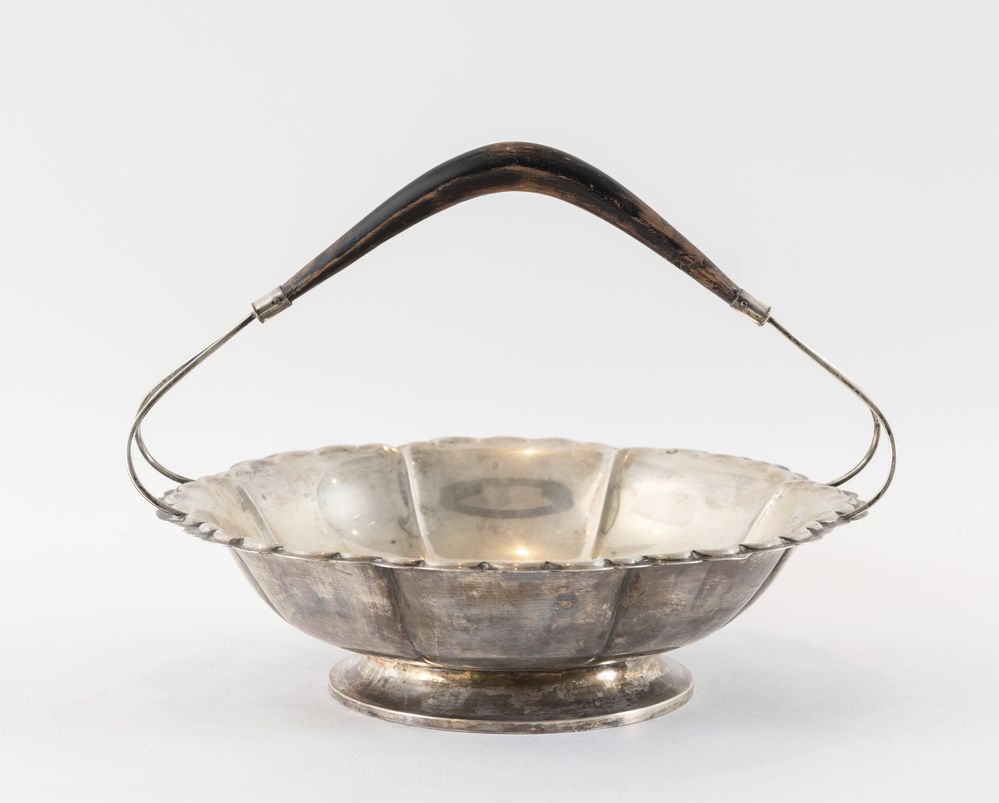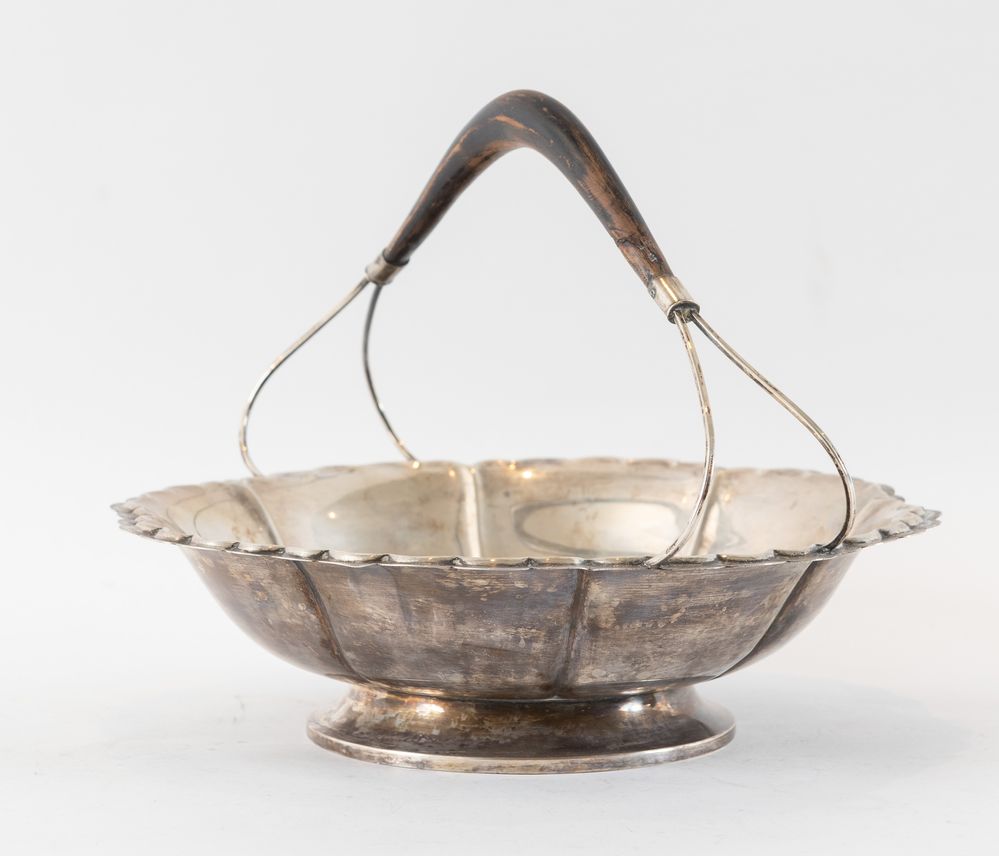 Cestello in argento con manico ligneo. Sotto la base reca punzoni: ARG, 800, 1954. Cm 21x30x28. Peso complessivo: 526 gr.
