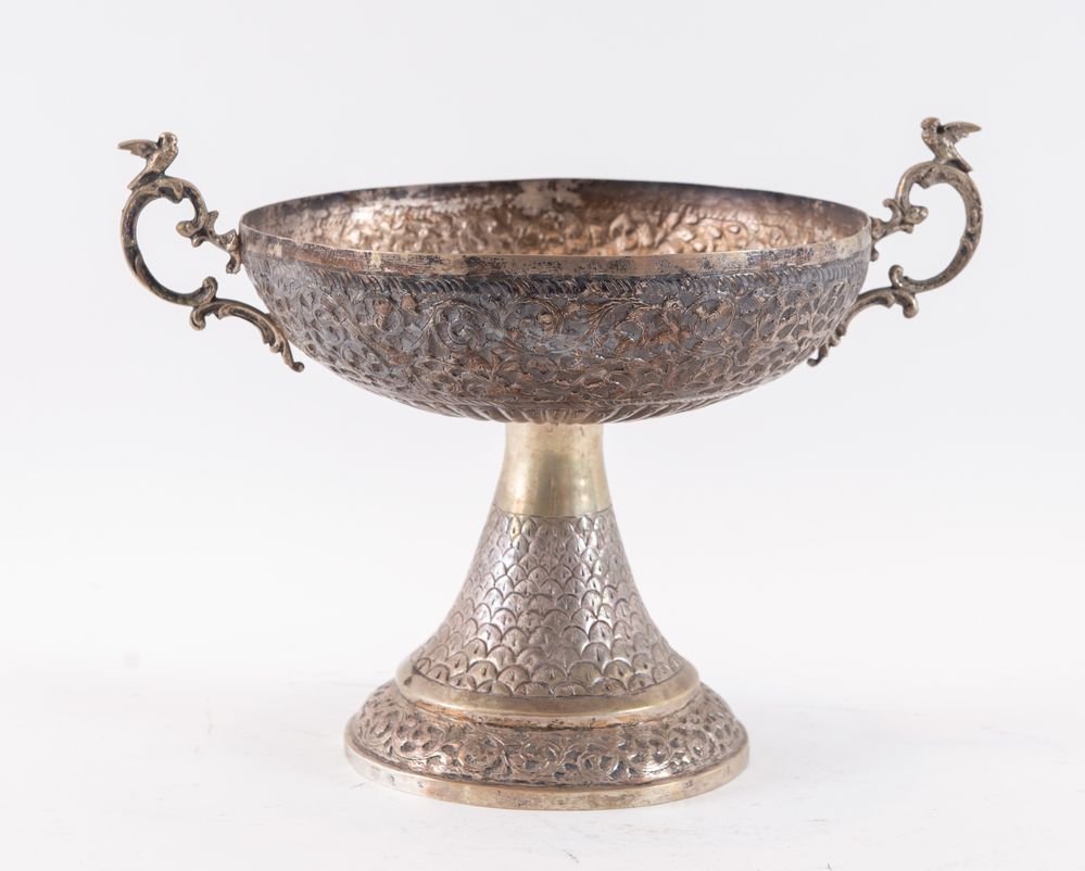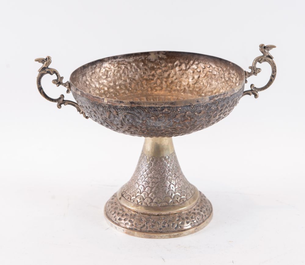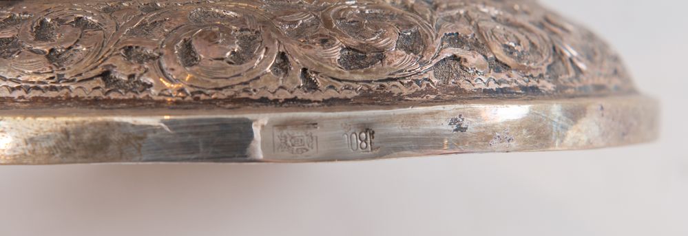 Alzata in argento 800. Sul bordo inferiore reca punzoni: 800, probabile stemma dell'argentiere. Cm 20,5x19,8x27,8. Peso: 670 gr.