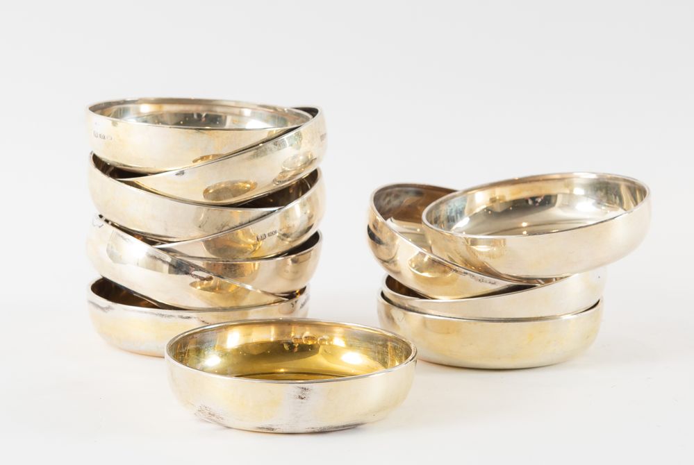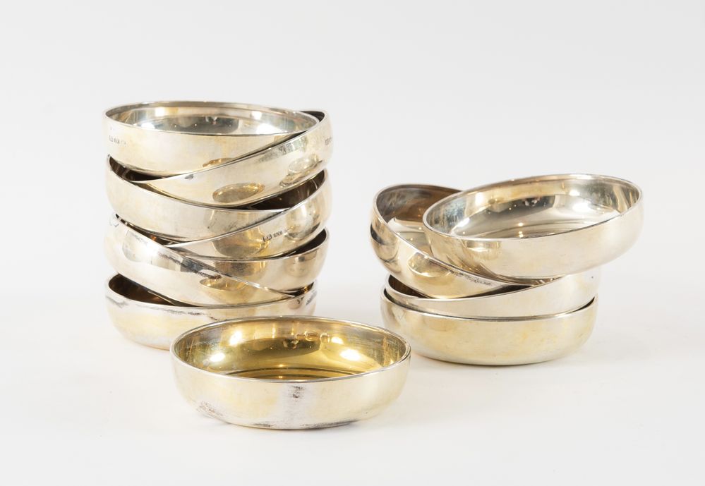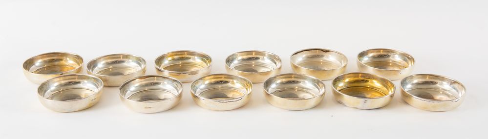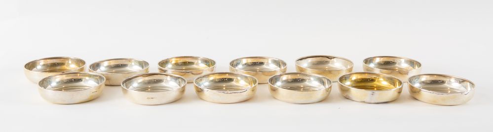 BRANDIMARTE, Firenze, XX secolo. Lotto composto da dodici coppe in argento 800 dorato. A lato recano punzoni: BR, 800, losanga locativa 283FI. Cadauna di cm Ø 11,5x3. Peso complessivo: 1051 gr.