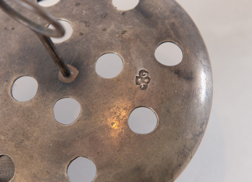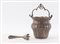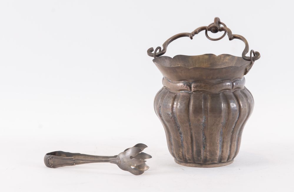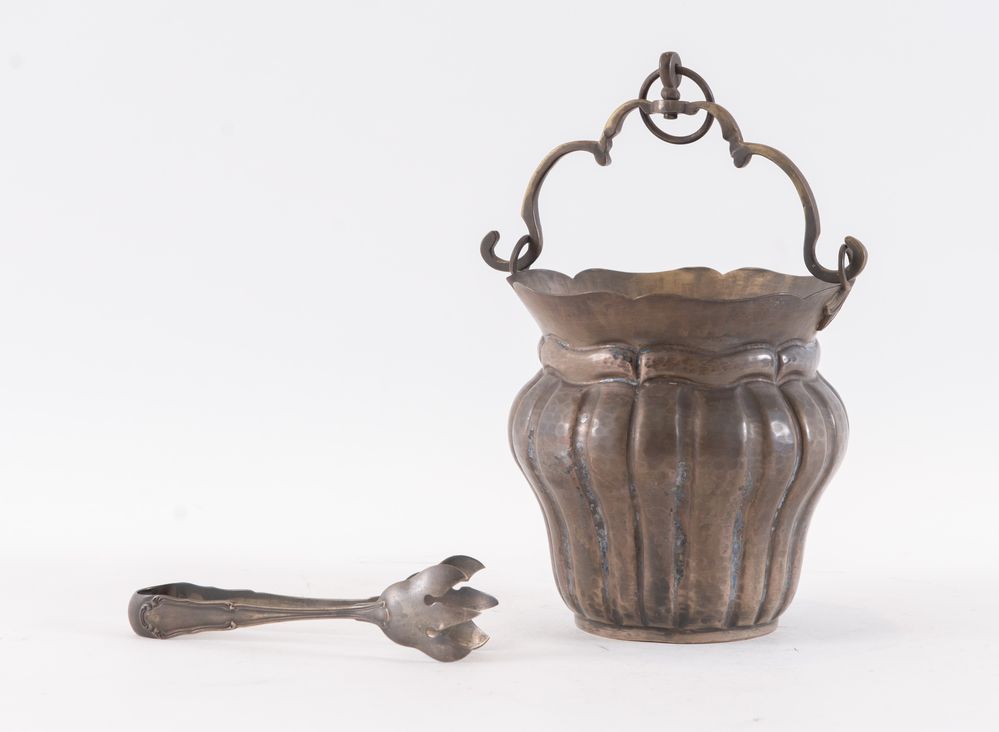 Padova, XX secolo. Secchiello portaghiaccio in argento. Sotto la base reca punzoni: probabile stemma dell'argentiere MG con stella. Sul manico la pinza reca punzoni: 800 e losanga locativa 29 PD. Cm (senza manico) 14xØ 14. Peso complessivo: 637 gr.
