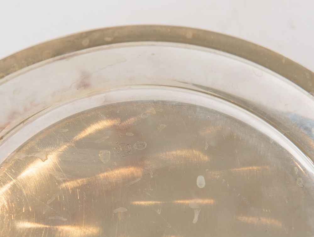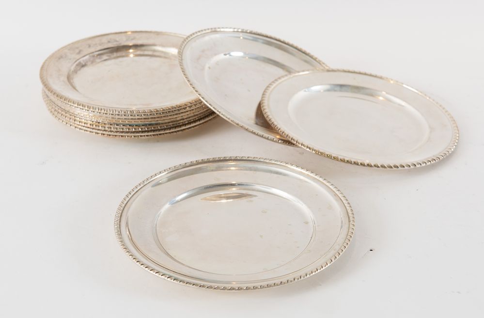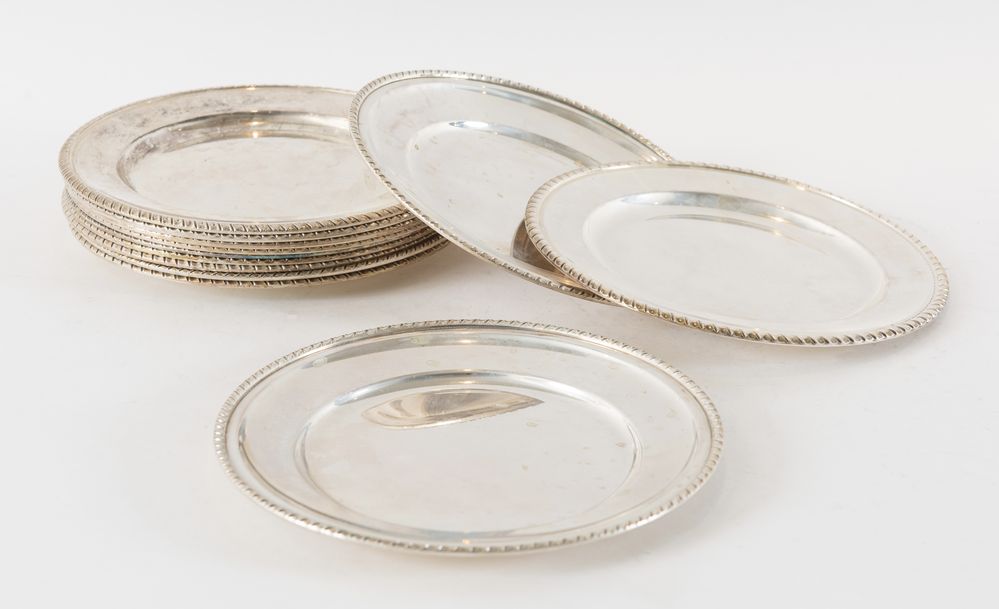 SCANABISSI BRUNO, Bologna, XX secolo. Lotto composto da dodici piattini in argento 800. Sotto la base recano punzoni: 800 e losanga locativa bolognese, stemma dell'argentiere. Cadauno di Ø cm 19. Peso: 1974 gr.