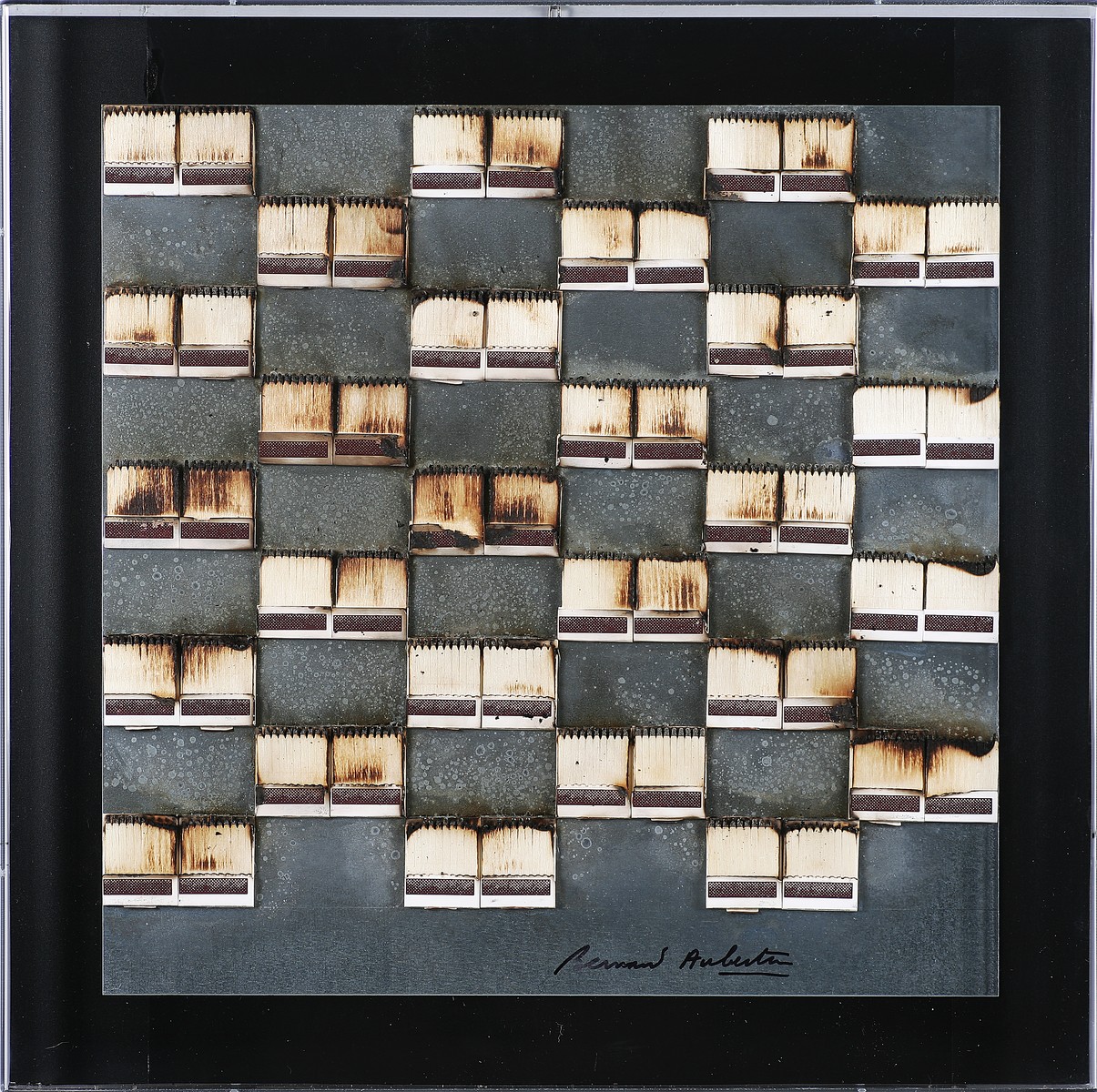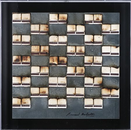 AUBERTIN BERNARD (n. 1934) Senza titolo. Fiammiferi su lamiera. Cm 50,00 x 50,00. In teca di plexiglass. Firma in basso. Autentica dell'artista su fotografia. Cornice presente