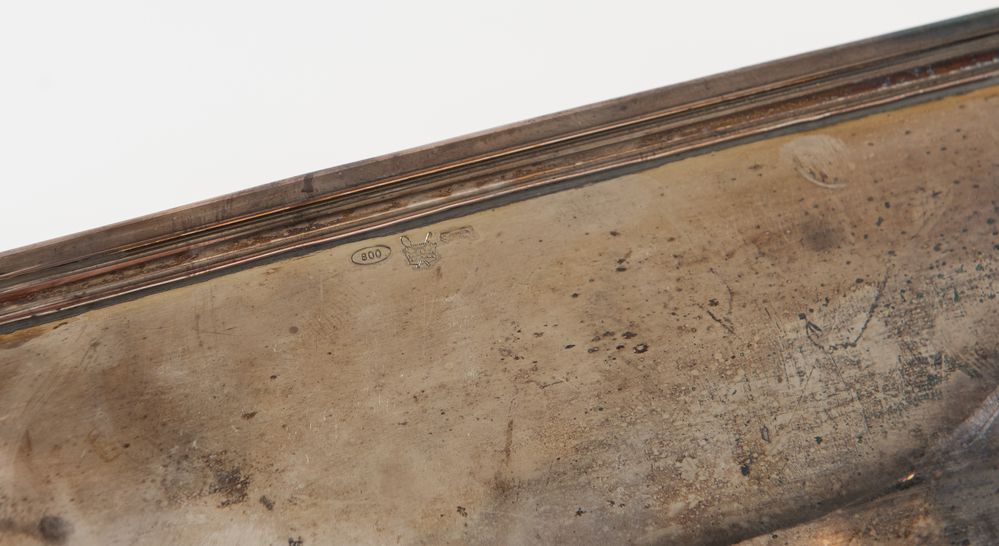 MANIFATTURA CESA, Alessandria, XX secolo. Centrotavola squadrato in argento 800 (Cesa). Sul bordo reca punzoni: 800, stemma dell'argentiere e losanga locativa 1AL. Cm 7,5x28,7x19,7. Peso: 655 gr.