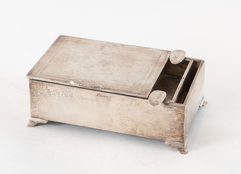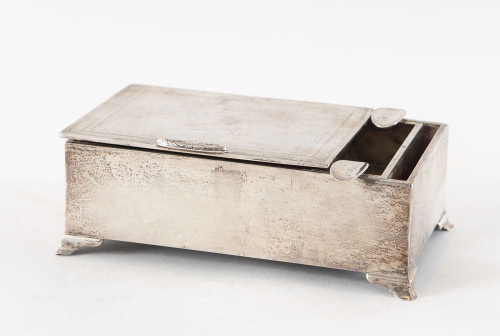 Henry Matthews, Birmingham, 1929. Scatola tabacchiera in argento. Sul lato reca punzoni: HM, ancora, leone passante, E. Cm 6x16,3x11. Peso complessivo: 583 gr.