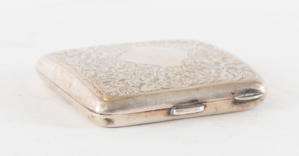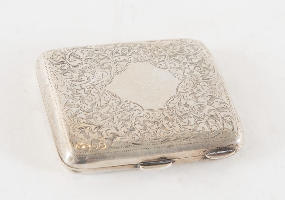 W H Haseler Ltd, Birmingham, 1919. Portasigarette in argento. All'interno reca punzoni: WHH, ancora, leone, lettera dataria U. Cm 8x7,1,5. Peso: 71 gr.